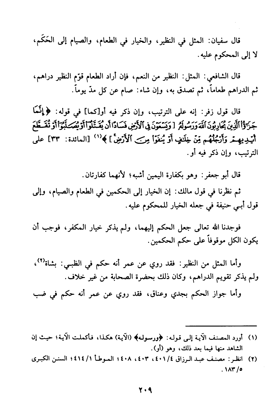 ثمَّ نَظرنَا فِي قَول مَالك إِن الْخِيَار إِلَى الْحكمَيْنِ فِي الطَّعَام وَالصِّيَام وَإِلَى قَول أبي حنيفَة فِي جعله الْخِيَار للمحكوم عَلَيْهِ