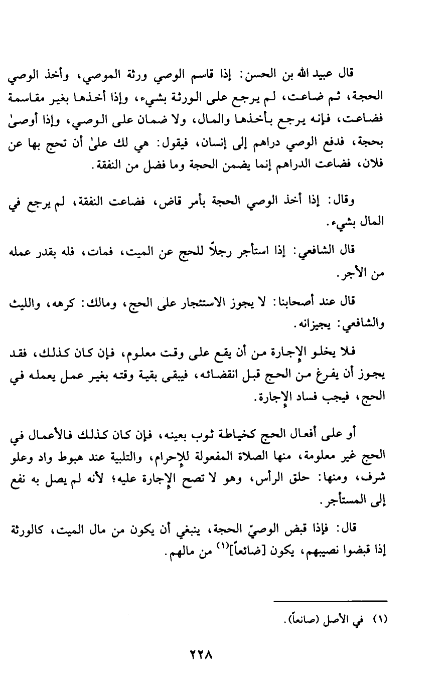 قَالَ عبيد الله بن الْحسن إِذا قَاسم الْوَصِيّ وَرَثَة الْمُوصي وَأخذ الْوَصِيّ الْحجَّة ثمَّ ضَاعَت لم يرجع على الْوَرَثَة بِشَيْء وَإِذا أَخذهَا بِغَيْر مقاسمة فَضَاعَت فَإِنَّهُ يرجع بأخذها وَالْمَال وَلَا ضَمَان على الْوَصِيّ وَإِذا أوصى بِحجَّة فَدفع الْوَصِيّ دَرَاهِم إِلَى إِنْسَان فَيَقُول هِيَ لَك على أَن تحج بهَا عَن فلَان فَضَاعَت الدَّرَاهِم إِنَّمَا يضمن الْحجَّة وَمَا فضل من النَّفَقَة