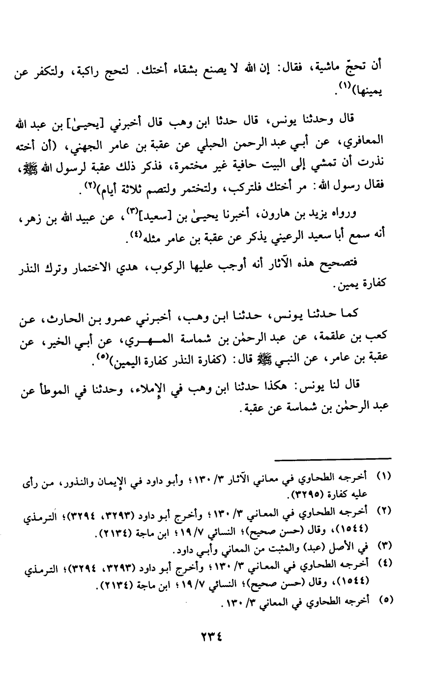 قَالَ وَحدثنَا يُونُس قَالَ حَدثنَا ابْن وهب قَالَ أَخْبرنِي يحيى بن عبد الله الْمعَافِرِي عَن أبي عبد الرَّحْمَن الحبلي عَن عقبَة بن عَامر الْجُهَنِيّ أَن أُخْته نذرت أَن تمشي إِلَى الْبَيْت حافية غير مختمرة فَذكر ذَلِك عقبَة لرَسُول الله صلى الله عَلَيْهِ وَسلم فَقَالَ رَسُول الله مر أختك فلتركب ولتختمر ولتصم ثَلَاثَة أَيَّام