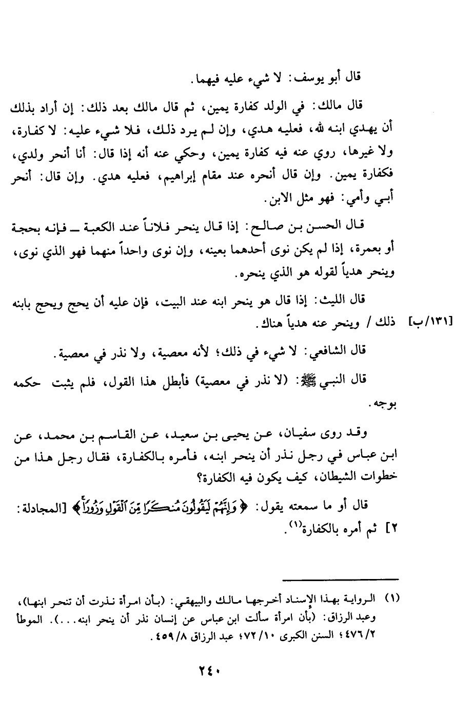 قَالَ مَالك فِي الْوَلَد كَفَّارَة يَمِين ثمَّ قَالَ مَالك بعد ذَلِك إِن أَرَادَ بذلك أَن يهدي ابْنه لله فَعَلَيهِ هدي وَإِن لم يرد ذَلِك فَلَا شَيْء عَلَيْهِ لَا كَفَّارَة وَلَا غَيرهَا رُوِيَ عَنهُ فِيهِ كَفَّارَة يَمِين وَحكي عَنهُ أَنه إِذا قَالَ أَنا أنحر وَلَدي فكفارة يَمِين وَإِن قَالَ أنحره عِنْد مقَام إِبْرَاهِيم فَعَلَيهِ هدي وَإِن قَالَ أنحر أبي وَأمي فَهُوَ مثل الابْن