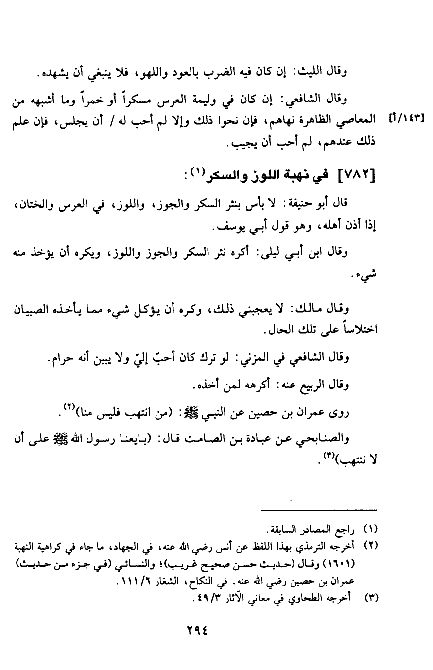 وَقَالَ ابْن أبي ليلى أكره نثر السكر والجوز واللوز وَيكرهُ أَن يُؤْخَذ مِنْهُ شَيْء