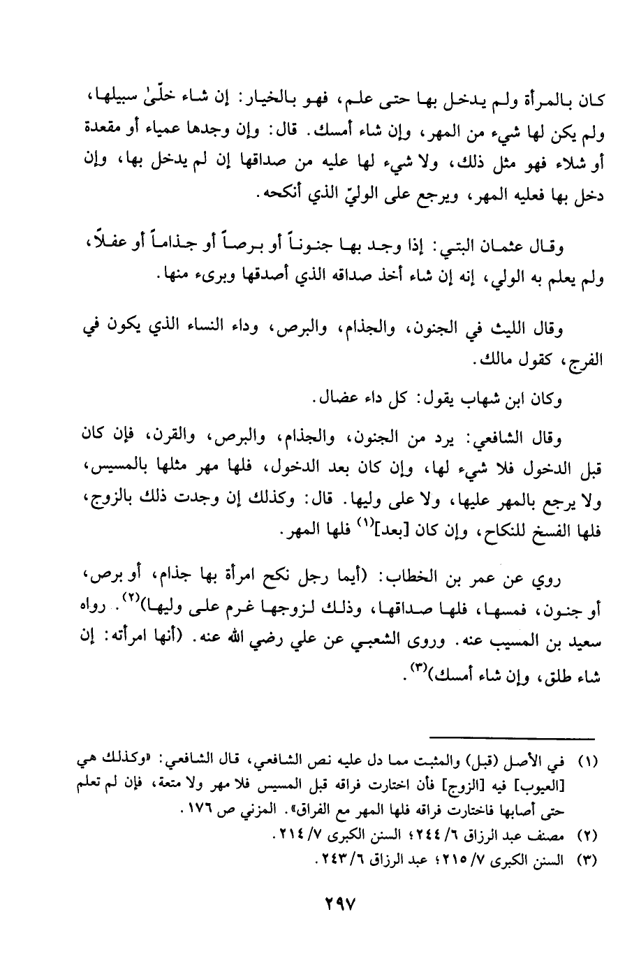 رُوِيَ عَن عمر بن الْخطاب أَيّمَا رجل نكح امْرَأَة بهَا جذام أَو برص أَو جُنُون فمسها فلهَا صَدَاقهَا وَذَلِكَ لزَوجهَا غرم على وَليهَا رَوَاهُ سعيد بن الْمسيب عَنهُ وروى الشّعبِيّ عَن عَليّ رَضِي الله عَنهُ أَنَّهَا امْرَأَته إِن شَاءَ طلق وَإِن شَاءَ أمسك