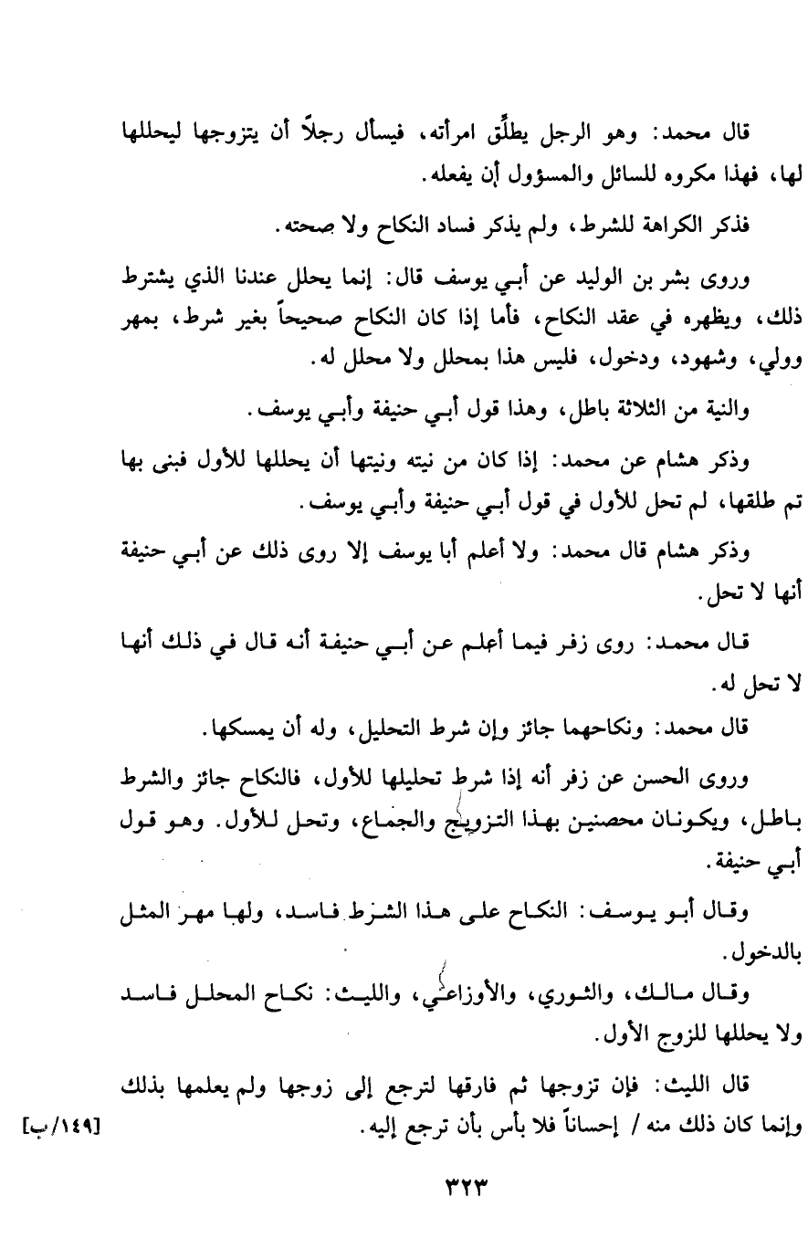 وروى بشر بن الْوَلِيد عَن أبي يُوسُف قَالَ إِنَّمَا يحلل عندنَا الَّذِي يشْتَرط ذَلِك وَيظْهر فِي عقد النِّكَاح فَأَما إِذا كَانَ النِّكَاح صَحِيحا بِغَيْر شَرط بِمهْر وَولي وشهود وَدخُول فَلَيْسَ هَذَا بِمُحَلل وَلَا مُحَلل لَهُ
