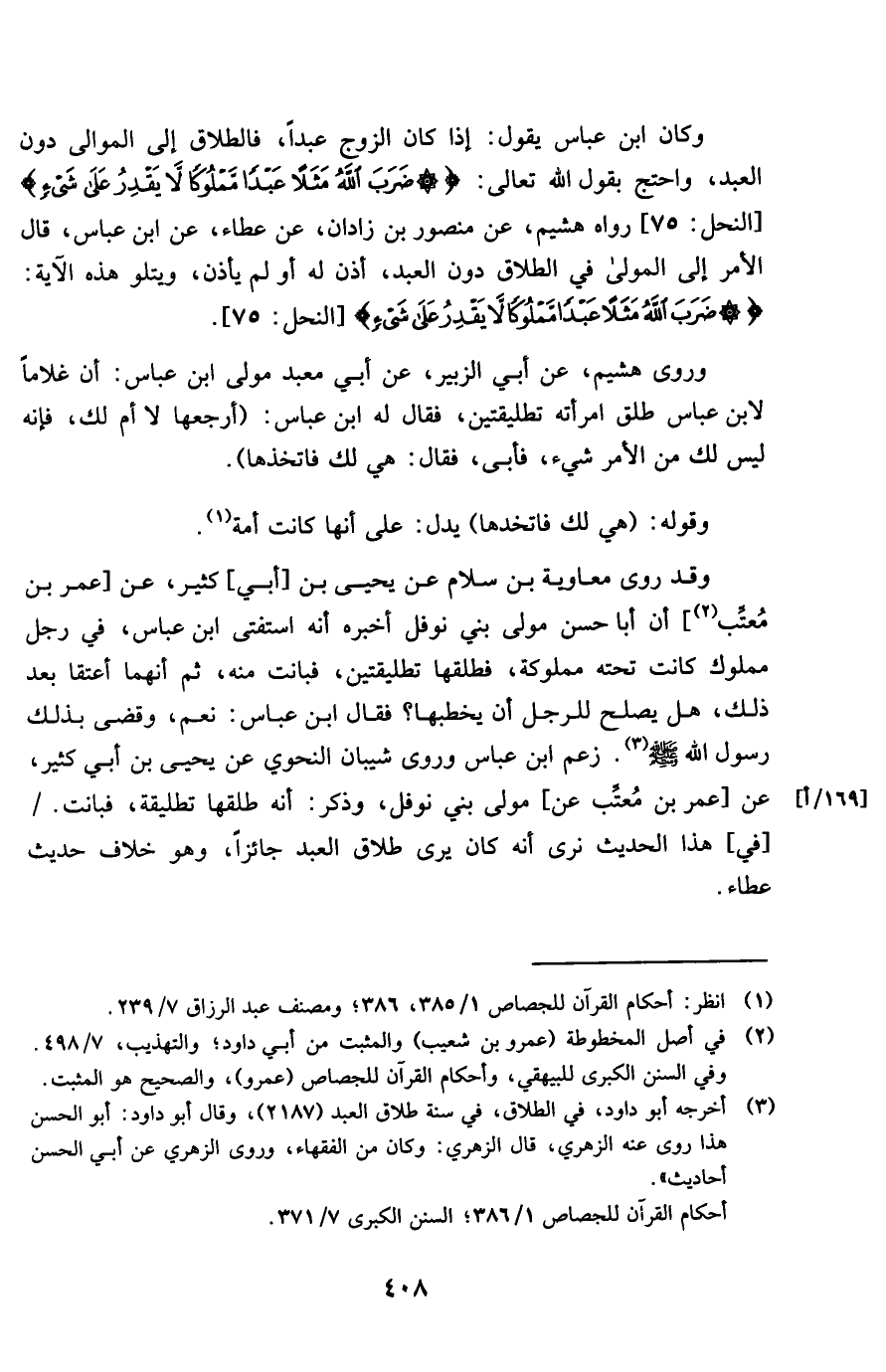وَكَانَ ابْن عَبَّاس يَقُول إِذا كَانَ الزَّوْج عبدا فالطلاق إِلَى الموَالِي دون العَبْد وَاحْتج بقول الله تَعَالَى {ضرب الله مثلا عبدا مَمْلُوكا لَا يقدر على شَيْء} النَّحْل 75 رَوَاهُ هشيم عَن مَنْصُور بن زادان عَن عَطاء عَن ابْن عَبَّاس قَالَ الْأَمر إِلَى الْمولى فِي لطلاق دون العَبْد اذن لَهُ أَو لم يَأْذَن وَيَتْلُو هَذِه الْآيَة {ضرب الله مثلا عبدا مَمْلُوكا لَا يقدر على شَيْء} النَّحْل 75