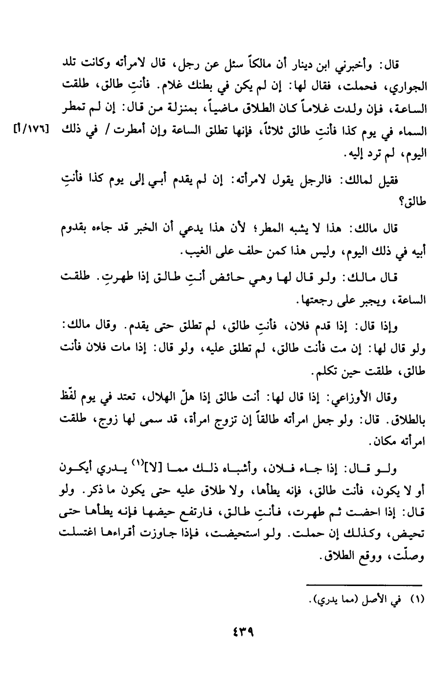 قَالَ وَأَخْبرنِي ابْن دِينَار أَن مَالِكًا سُئِلَ عَن رجل قَالَ لامْرَأَته وَكَانَت تَلد الْجَوَارِي فَحملت فَقَالَ لَهَا إِن لم يكن فِي بَطْنك غُلَام فَأَنت طَالِق طلقت السَّاعَة فَإِن ولدت غُلَاما كَانَ الطَّلَاق مَاضِيا بِمَنْزِلَة من قَالَ إِن لم تمطر السما فِي يَوْم كَذَا فَأَنت طَالِق ثَلَاثًا فَإِنَّهَا تطلق السَّاعَة وَإِن أمْطرت (176 ب) فِي ذَلِك الْيَوْم لم ترد إِلَيْهِ