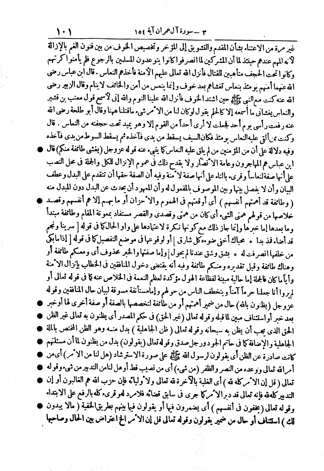 غيرَ مرةٍ من الاعتناء بشأن المقدمِ والتشويقِ إلى المؤخر وتخصيصُ الخوفِ من بين فنونِ الغمِّ بالإزالة لأنه المهمُّ عندهم حينئذ لما أن المشركين لما انصرفوا كانوا يتوّعدون المسلمين بالرجوع فلم يأمنوا اكرتهم وكانوا تحت الحَجَفِ متأهّبين للقتال فأنزل الله تعالى عليهم الأمنةَ فأخذهم النعاسُ قال ابن عباس رضي الله عنهما أمنَّهم يومئذ بنعاس تغشّاهم بعد خوفٍ وإنما ينعَسُ من أمِنَ والخائفُ لا ينام وقال الزبير رضيَ الله عنه كنتُ مع النبيِّ صلَّى الله عليهِ وسلم حين اشتد الخوفُ فأنزل الله علينا النومَ والله لأسمع قولَ مُعتبِ بنِ قشير والنعاسُ يغشاني ما أسمعه إلا كالحُلُم يقول لو كان لنا من ألمر شيء ما قلنا إنى ههنا وقال أبو طلحة رضى الله عنه رفعتُ رأسي يومَ أحُدٍ فجعلتُ لا أرى أحداً من القوم إلا وهو يَميدُ تحت حَجَفَتِه من النعاس قال وكنتُ ممن أُلقِيَ عليه النعاسُ يومئذ فكان السيفُ يسقُط من يدي فآخذُه ثم يسقُط السَّوْطُ من يدي فآخُذه وفيه دلالة على أن من المؤمنين من لم يُلْقَ عليه النعاسُ كما ينبئ عنه قولُه عزَّ وجلَّ