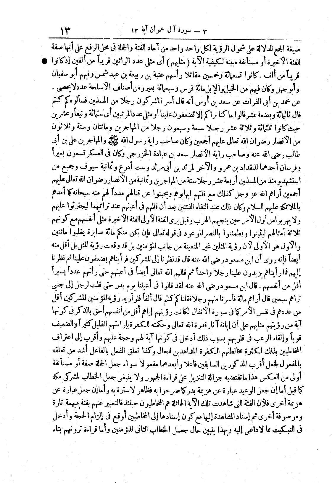 عن محمد بن أبي الفرات عن سعد بن أوس أنه قال أسرَ المشركون رجلاً من المسلمين فسألوه كم كنتم قال ثلثُمائةٍ وبضعةَ عشرَ قالوا ما كنا نراكم إلا تُضعِفون علينا أو مثلي عددِ المرئيّين أي ستَّمائةٍ ونيفاً وعشرين حيث كانوا ثلثمائة وثلاثةَ عشرَ رجلاً سبعةٌ وسبعون رجلاً من المهاجرين وما ئتان وستة وثلاثون من الأنصار رضوانُ الله تعالَى عليهم أجمعين وكان صاحبَ رايةِ رسول الله صلى الله عليه وسلم والمهاجرين عليُّ بنُ أبي طالبٍ رضي الله عنه وصاحبَ راية الأنصار سعدُ بن عبادة الخزرجي وكان في العسكر تسعون بعيراً وفَرَسان أحدُهما للمِقداد بن عَمْرو والآخر لمَرْثَد بن أبي مَرْثَد وستُّ أدرع وثمانيةُ سيوف وجميع منِ استُشهد يومئذٍ من المسلمين أربعةَ عشرَ رجلاً ستةٌ من المهاجرين وثمانية من الأنصار رضوانُ الله تعالَى عليهم أجمعين أراهم الله عز وجل كذلك مع قِلتهم ليَهابوهم ويَجبُنوا عن قتالهم مدداً لهم منه سبحانه كما أمدهم بالملائكة عليهم السلام وكان ذلك عند التقاء الفئتين بعد أن قلَّلَهم في أعينهم عند ترائيهما ليجترئوا عليهم ولا يهرُبوا من أول الأمر حين ينجيهم الهرب وقيل يري الفئةُ الأولى الفئةُ الأخيرةَ مثليْ أنفسِهم مع كونهم ثلاثةَ أمثالِهم ليثبُتوا ويطمئنوا بالنصر الموعودِ في قولِهِ تعالَى فَإِن يَكُن مّنكُمْ مّاْئَةٌ صابرة يغلبوا ما ئتين والأولُ هو الأولى لأن رؤية المثلين غير المتعينة من جانب المؤمنين بل قد وقعت رؤيةُ المثل بل أقلَّ منه أيضاً فإنه روي أن ابن مسعود رضي الله عنه قال قد نظرنا إلى المشركين فرأيناهم يُضعِفون علينا ثم نظرنا إليهم فما رأيناهم يزيدون علينا رجلاً واحداً ثم قلّلهم الله تعالى أيضاً في أعينهم حتى رأتهم عدداً يسيراً أقلَّ من أنفسهم قال ابن مسعود رضي الله عنه لقد قُلِّلوا في أعيننا يوم بدر حتى قلت لرجل إلى جنبي تراهم سبعين قال أراهم مائة فأسرنا منهم رجلاً فقلنا كم كنتم قال ألفاً فلو أريد رؤية المؤمنين المشركين أقلَّ من عددهم في نفس الأمر كما في سورة الأنفال لكانت رؤيتُهم إياهم أقلَّ من أنفسهم أحقَّ بالذكر في كونها آيةً من رؤيتهم مِثلَيهم على أن إبانةَ آثارِ قُدرةِ الله تعالى وحكمتِه للكفرة بإراءتهم القليلَ كثيراً والضعيفَ قوياً وإلقاءِ الرعب في قلوبهم بسبب ذلك أدخلُ في كونِها آيةً لهم وحجةً عليهم وأقربَ إلى اعتراف المخاطبين بذلك لكثرة مخالطتِهم الكفرةَ المشاهدين للحال وكذا تعلقُ الفعل بالفاعل أشد من تعلقه بالمفعول فجعلُ أقربِ المذكورَين السابقَين فاعلاً وأبعدِهما مفعولاً سواءٌ جعلُ الجملة صفةً أو مستأنفة أولى من العكس هذا ما تقتضيه جزالةُ التنزيلِ على قراءة الجُمهور ولا ينبغي جعلُ الخطاب لمشركي مكة كما قيل أما إن جُعل الوعيد عبارةً عن هزيمة بدر كما صرحوا به فظاهر لا سِترةَ به وأما إن جُعل عبارةً عن هزيمة أخرى فلأن الفئةَ التي شاهدت تلك الآيةَ الهائلة هم المخاطبون حينئذ فالتعبير عنهم بفئة مُبهمةٍ تارة وموصوفةٍ أخرى ثم إسنادُ المشاهدة إليها مع كون إسنادها إلى المخاطبين أوقعُ في إلزام الحجة وأدخلُ في التبكيت مما لاَ دَاعيَ إليهِ وبهذا يتبين حال جعلِ الخطابِ الثاني للمؤمنين وأما قراءة ترونهم بتاء