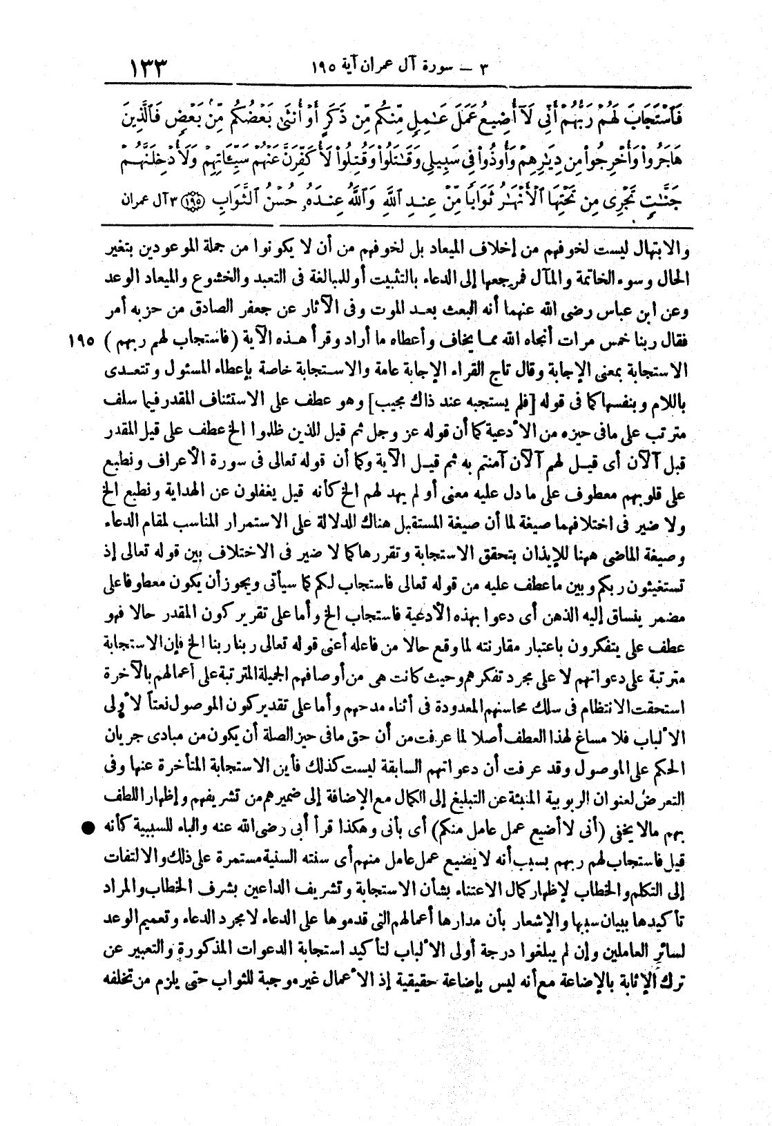 195 - آل عمران والابتهالِ ليست لخوفهم من إخلاف الميعادِ بل لخوفهم من أن لا يكونوا من جملة الموعودين بتغير الحالِ وسوءِ الخاتمةِ والمآلِ فمرجِعُها إلى الدعاء بالتثبيت أو للمبالغة في التعبُّد والخشوعِ والميعادُ الوعدُ وعن ابن عباس رضي الله عنهما أنه البعثُ بعد الموت وفي الآثار عن جعفر الصادق من حزبه أمرٌ فقال ربنا خمسَ مراتٍ أنجاه اللَّهُ مما يخاف وأعطاه ما أراد وقرأ هذه الآية