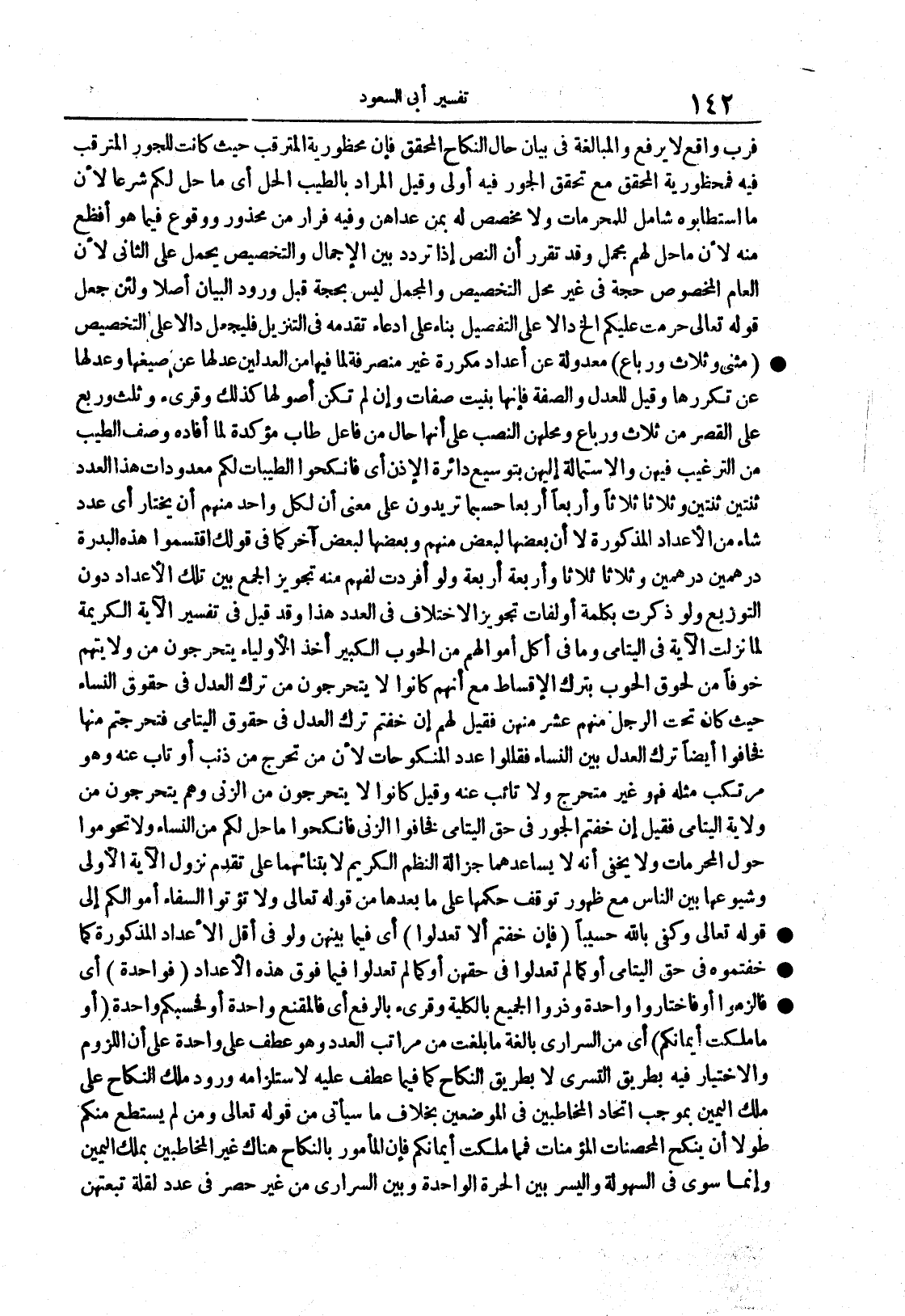{مثنى وثلاث وَرُبَاعَ} معدولةٌ عن أعداد مكررةٍ غيرُ منصرفةٍ لما فيها من العدْلين عدلِها عن صِيَغها وعدلِها عن تكرُّرِها وقيل للعدل والصفةِ فإنها بُنيت صفاتٍ وإن لم تكن أصولها كذلك وقرئ وثُلَثَ ورُبَعَ على القصر من ثلاثَ ورُباعَ ومحلُّهن النَّصبِ على أنَّها حالٌ من فاعل طاب مؤكدةٌ لما أفاده وصفُ الطيّبِ من الترغيب فيهن والاستمالةِ إليهن بتوسيع دائرةِ الإذْنِ أى فانحكوا الطيباتِ لكم معدوداتٍ هذا العددَ ثنتين ثنتين وثلاثاً ثلاثاً وأربعاً أربعاً حسبما تريدون على معنى أن لكل واحدٍ منهم أن يختار أيَّ عددٍ شاء من الأعداد المذكورة لا أن بعضَها لبعض منهم وبعضَها لبعض آخرَ كما في قولك اقتسِموا هذه البَدْرةَ درهمين درهمين وثلاثا ثلاثا وأربعةً أربعة ولو أُفردت لفُهم منه تجويزُ الجمعِ بين تلك الأعدادِ دون التوزيعِ ولو ذكرت بكلمة أو لفات تجويزُ الاختلافِ في العدد هذا وقد قيل في تفسير الآيةِ الكريمةِ لما نزلت الآية في اليتامى وما في أكل أموالِهم من الحُوب الكبيرِ أخذ الأولياءُ يتحرّجون من ولايتهم خوفاً من لحوق الجوب بترك الإقساطِ مع أنهم كانوا لايتحرجون من ترك العدلِ في حقوق النساءِ حيث كان تحت الرجلِ منهم عشرٌ منهن فقيل لهم إن خفتم تركَ العدلِ في حقوق اليتامى فتحرّجتم منها فخافوا أيضاً تركَ العدلِ بين النساءِ فقلِّلوا عددَ المنكوحاتِ لأن من تحرّج من ذنب أو تاب عنه وهو مرتكبٌ مثلَه فهو غيرُ متحرِّجٍ ولا تائبٍ عنه وقيل كانوا لا يتحرجون من الزنى وهم يتحرّجون من ولاية اليتامى فقيل إن خفتم الجَوْرَ في حق اليتامى فخافوا الزنى فانكِحوا ما حل لكم من النساء ولا تحرموا حولَ المحرَّماتِ ولا يخفى أنه لا يساعدهما جزالةُ النظم الكريم لابتنائهما على تقدّم نزولِ الآيةِ الأولى وشيوعِها بين الناسِ مع ظهور توقفِ حُكمِها على ما بعدها من قوله تعالى وَلاَ تُؤْتُواْ السفهاء أموالكم إلى قوله تعالى وكفى بالله حَسِيباً