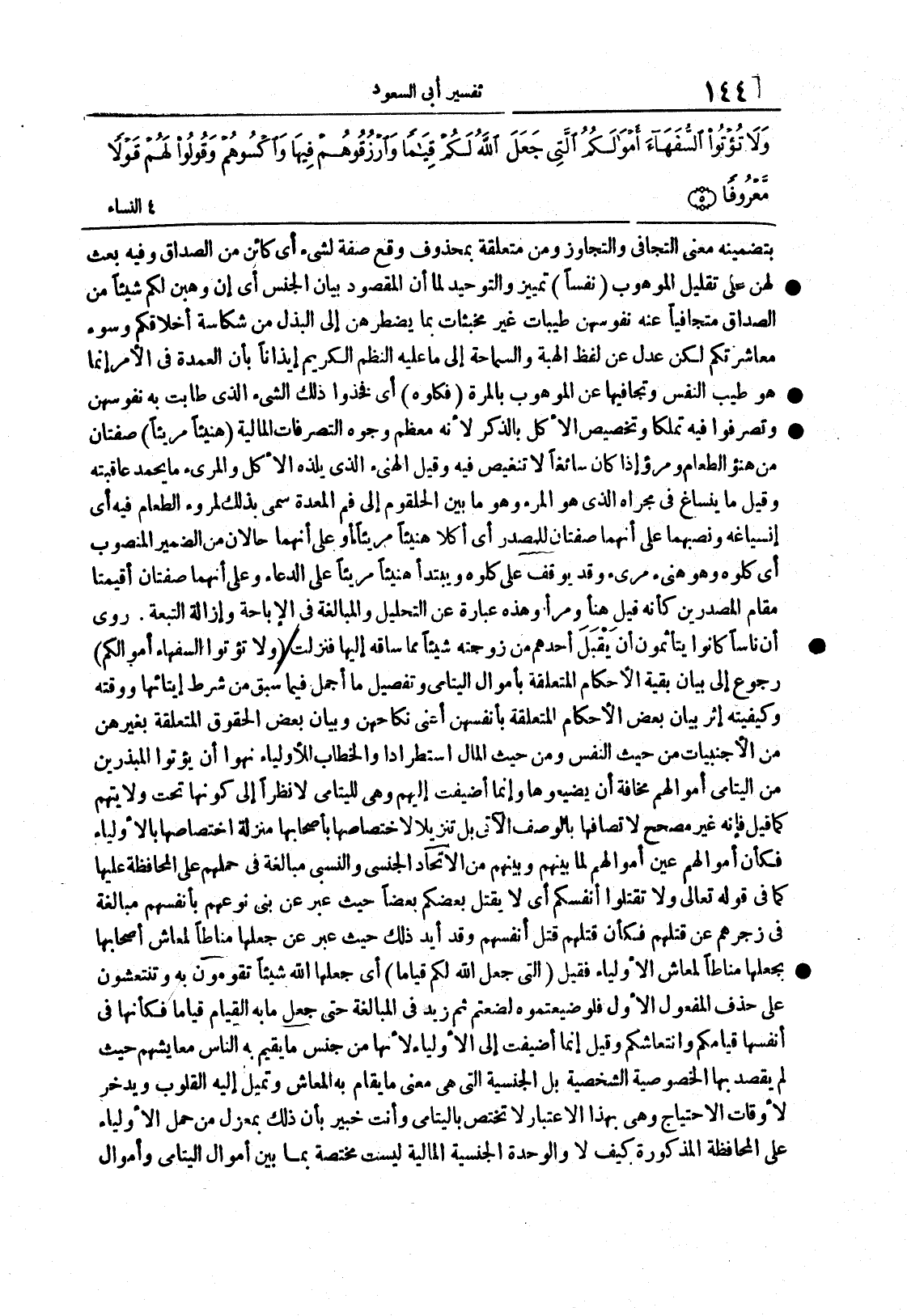 {وَلاَ تُؤْتُواْ السفهاء أموالكم} رجوعٌ إلى بيان بقيةِ الأحكامِ المتعلقةِ بأموال اليتامى وتفصيلُ ما أُجمل فيما سبقَ من شرط إيتائِها ووقتِه وكيفيتِه إثرَ بيانِ بعضِ الأحكامِ المتعلقةِ بأنفسهن أعني نكاحَهن وبيانِ بعضِ الحقوقِ المتعلقةِ بغيرهن من الأجنبيات من حيث النفسُ ومن حيث المالُ استطراداً والخطابُ للأولياء نُهوا أن يؤتوا المبذرين من اليتامى أموالَهم مخافةَ أن يضيِّعوها وإنما أضيفت إليهم وهي لليتامى لا نظراً إلى كونها تحتَ ولايتِهم كما قيل فإنه غيرُ مصحِّحٍ لاتصافها بالوصف الآتي بل تنزيلاً لاختصاصها بأصحابها منزلةَ اختصاصِها بالأولياء فكأن أموالَهم عينُ أموالِهم لما بينهم وبينهم من الاتحاد الجنسيِّ والنَّسَبي مبالغةً في حملهم على المحافظة عليها كما في قولِه تعالى {وَلاَ تَقْتُلُواْ أَنفُسَكُمْ} أي لا يقتُلْ بعضُكم بعضاً حيث عبّر عن بني نوعِهم بأنفسهم مبالغةً في زجرهم عن قتلهم فكأن قتلَهم قتلُ أنفسِهم وقد أيد ذلك حيث عبر عن جعلها مناطا لمعاش أصحابها بجعلها مناطاً لمعاشِ الأولياء فقيل