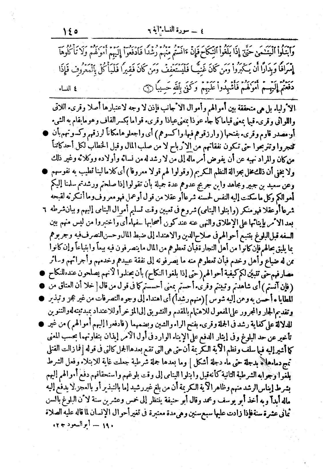 {فادفعوا إِلَيْهِمْ أموالهم} من غير تأخيرٍ عن حد البلوغِ وفي إيثار الدفعِ على الإيتاء الواردِ في أول الأمرِ إيذانٌ بتفاوتهما بحسسب المعنى كما أُشيرَ إليهِ فيما سلف ونظم الآية الكريمة أن حتى هي التي تقع بعدها الجمل كالتي في قوله ... فما زالت القتلى تمُجُّ دماءَها ... بدِجلةَ حتى ماءُ دِجلةَ أشكلُ ... وما بعدها جملةٌ شرطيةٌ جُعلت غايةً للابتلاء وفعلُ الشرطِ بَلَغُواْ وجوابُه الشرطيةُ الثانيةُ كأنه قيل وابتلوا اليتامى إلى وقت بلوغِهم واستحقاقِهم دفعَ أموالِهم إليهم بشرط إيناسِ الرُشدِ وظاهرُ الآيةِ الكريمةِ أن من بلغ غيرَ رشيدٍ إما بالتبذير أو بالعجز لا يدفع إليه مالُه أبداً وبه أخذ أبو يوسفَ ومحمدٌ وقال أبو حنيفة ينتظر إلى خمس وعشرين سنةً لأن البلوغ بالسن ثماني عشرة سنةً فإذا زادت عليها سبعُ سنين وهي مدةٌ معتبرةٌ في أحوالِ الإنسانِ لما قالَه عليه الصَّلاةُ