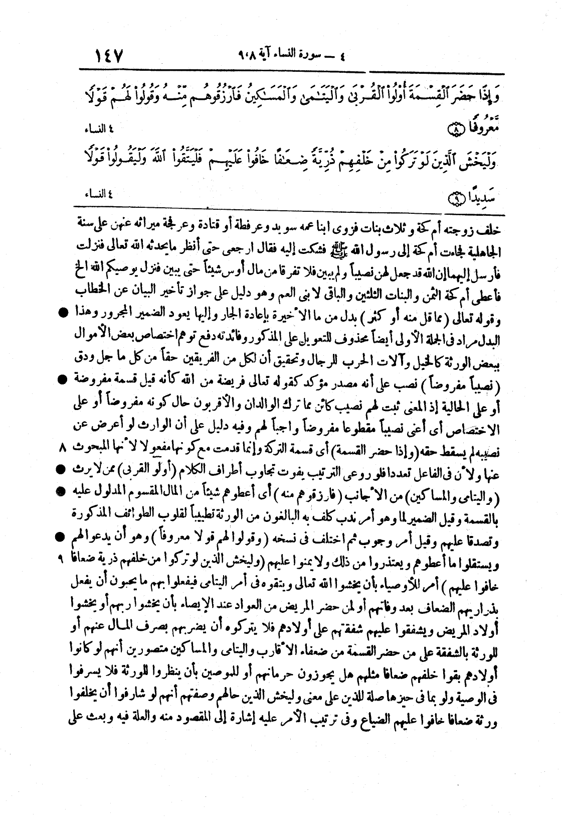 8 - 9 النساء خلف زوجته أم كحة وثلاث بنات فزوى ابنا عمِّه سويدٌ وعرفطةُ أو قتادةُ وعَرْفجةُ ميراثَه عنهن على سنة الجاهلية فجاءت أم كحة إلى رسول الله صلى الله عليه وسلم فشكت إليه فقال ارجِعي حتى أنظُر ما يُحدِثه الله تعالى فنزلت فأرسل إليهما إن الله قد جعل لهن نصيباً ولم يبيِّنْ فلا تُفرِّقا من مال أوسٍ شيئاً حتى يبين فنزل يوصيكم الله الخ فأعطى أم كحة الثمنَ والبناتِ الثلثين والباقي لا بنى العمِّ وهو دليلٌ على جواز تأخيرِ البيانِ عن الخطاب وقولُه تعالى