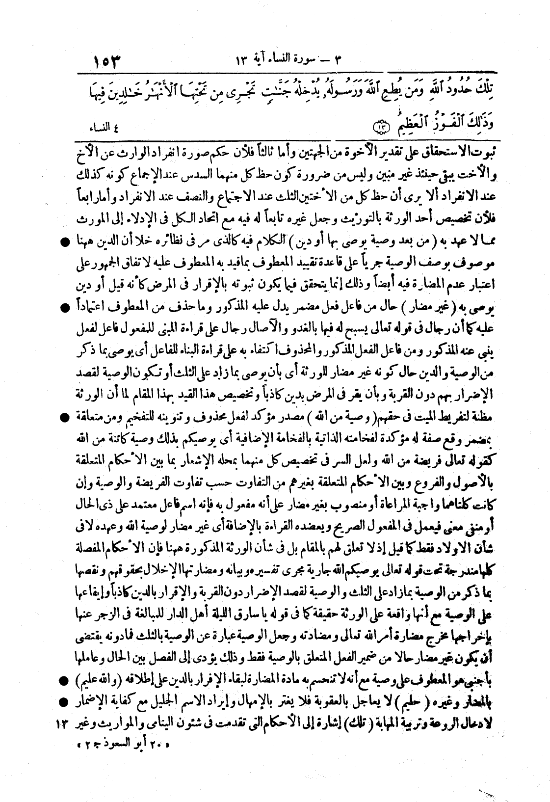 13 - النساء ثبوت الاستحقاقِ على تقدير الأُخوةِ من الجهتين وأما ثالثاً فلأن حُكمَ صورةِ انفرادِ الوارثِ عن الأخ والأختِ يبقى حينئذ غيرَ مُبيِّنٍ وليس من ضرورة كونِ حظِّ كلَ منهما السدسَ عند الإجماع كونُه كذلك عند الانفراد ألا يرى أن حظ كلَ من الأختين الثلثُ عند الاجتماعِ والنصفُ عند الانفراد وأما رابعاً فلأن تخصيصَ أحد الورثة بالتورث وجعل غيره تابعا له فيه مع اتحادِ الكلِّ في الإدلاءِ إلى المُورِّث مما لا عهدَ به