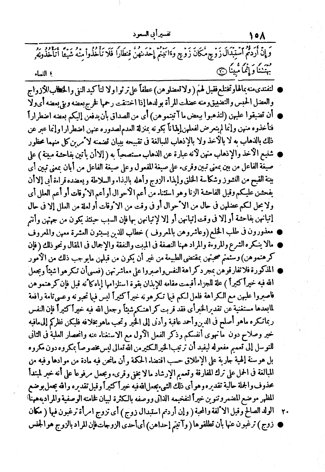 {إِلاَّ أَن يَأْتِينَ بِفَاحِشَةٍ مُّبَيّنَةٍ} على صيغة الفاعلِ من بيَّن بمعنى تبين وقرئ على صيغة المفعولِ وعلى صيغة الفاعل من أبان بمعنى تبين أي بيِّنةِ القُبحِ من النشوز وشكاسةِ الخلُقِ وإيذاءِ الزوجِ وأهلِه بالبَذاء والسَّلاطةِ ويعضُده قراءة أُبي إلا أنْ يُفْحِشْن عليكُم وقيل الفاحشة الزنا وهو استئناءٌ من أعمِّ الأحوالِ أو أعمِّ الأوقاتِ أو أعمِّ العللِ أي ولا يحلِ لكم عضْلُهن في حالٍ من الأحوالِ أو في وقتٍ من الأوقات أولعلة من العِللِ إلا في حال إتيانِهن بفاحشة أو إلا في وقت إتيانِهن أو إلا لإتيانهن بها فإن السببَ حينئذٍ يكون من جهتهن وأنتم معذورن في طلب الخُلْع