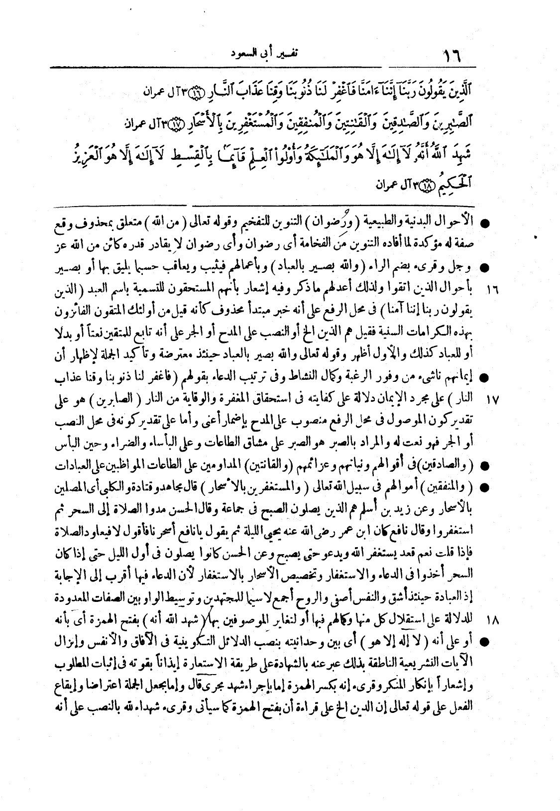 {والمستغفرين بالاسحار} قال مجاهد وقتادة والكلبي أي المصلين بالأسحار وعن زيد بن أسلَمَ هم الذين يصلون الصبحَ في جماعة وقال الحسن مدُّوا الصلاة إلى السحر ثم استغفروا وقال نافع كان ابن عمرَ رضي الله عنه يحيي الليلة ثم يقول يا نافع أسْحَرْنا فأقول لا فيعاود الصلاة فإذا قلت نعم قعد يستغفر الله ويدعو حتى يصبح وعن الحسن كانوا يصلون في أول الليل حتى إذا كان السحر أخذوا في الدعاء والاستغفار وتخصيصُ الأسحار بالاستغفار لأن الدعاء فيها أقربُ إلى الإجابة إذ العبادة حينئذ أشق والنفسُ أصفى والروح أجمعُ لاسيما للمجتهدين وتوسيط الواو بين الصفات المعدودة للدلالة على استقلالِ كلِّ منها وكما لهم فيها أو لتغايُر الموصوفين بها