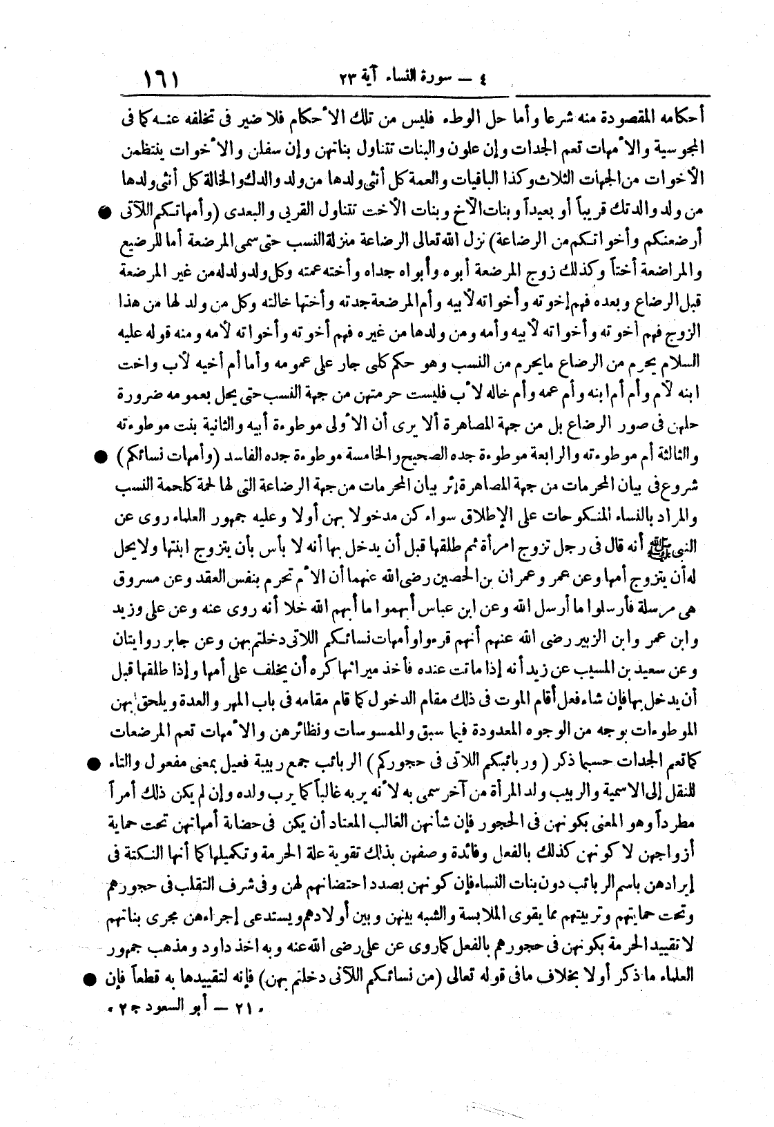 أحكامِه المقصودةِ منه شرعاً وأما حلُّ الوطءِ فليس من تلك الأحكامِ فلا ضيرَ في تخلُّفه عنه كما في المجوسية والأمهاتُ تعُمُّ الجداتِ وإن عَلَوْن والبناتُ تتناول بناتِهن وإن سفَلْن والأخواتُ ينتظِمْن الأخواتِ من الجهات الثلاثِ وكذا الباقياتُ والعمةُ كلُّ أنثى ولدَها مَنْ وَلدَ والدَك والخالةُ كلُّ أنثى ولدَها مَنْ ولدَ والدتَك قريباً أو بعيداً وبناتُ الأخِ وبنات الأخت تتناول القربى والبعدى