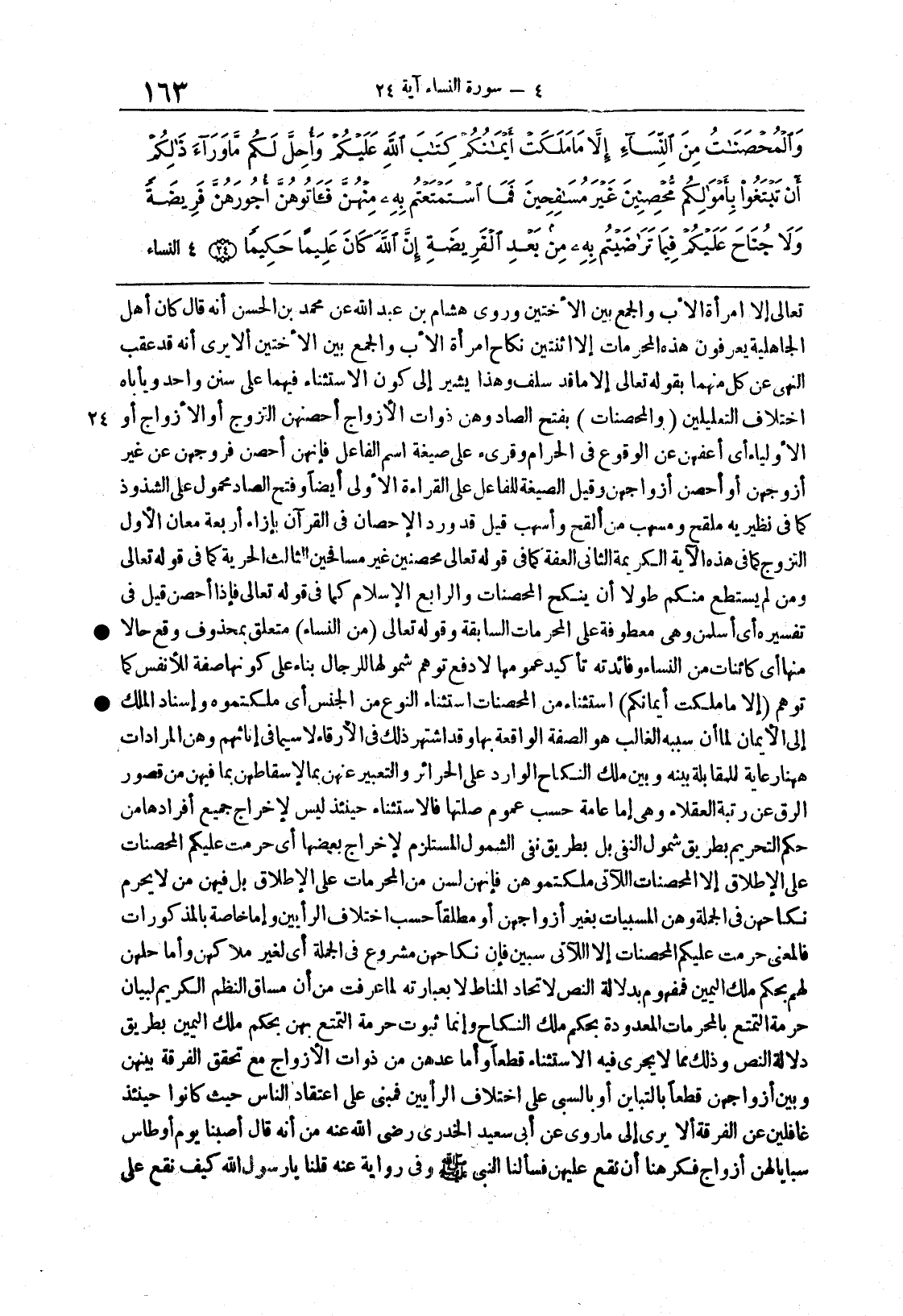 24 - النساء تعالى امرأة الأب والجمع بين الأختين وروى هشامُ بنُ عبدِ اللَّه عن محمد بنِ الحسنِ أنه قال كان أهلُ الجاهلية يعرِفون هذه المحرماتِ إلا اثنتين نكاحَ امرأةِ الأبِ والجمعَ بين الأختين ألا يُرى أنه قد عُقِّب النهيُ عن كل منهما بقوله تعالى إَلاَّ مَا قَدْ سَلَفَ وهذا يُشير إلى كون الاستثناءِ فيهما على سَنن واحدٍ ويأباه اختلافُ التعليلين