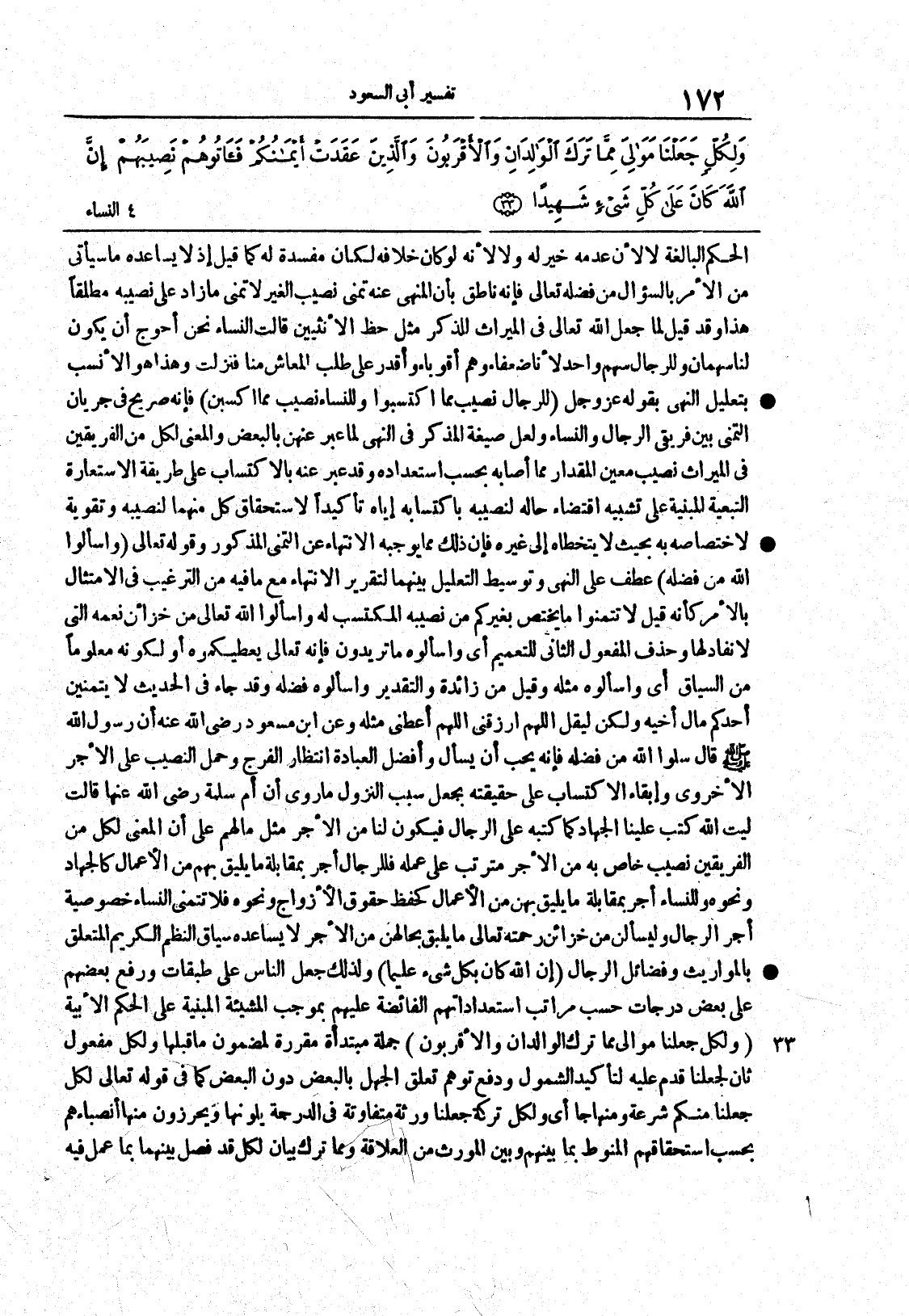 33 - النساء الحكم البالغة لالأن عدمه خير له ولالأنه لو كان خلافَه لكان مفسدةً له كما قيلَ إذْ لا يساعدُه ما سيأتي من الأمر بالسؤال من فضله تعالى فإنه ناطِقٌ بأن المنهيَّ عنه تمنى نصيب الغير لاتمنى مازاد على نصيبه مطلقاً هذا وقد قيل لما جعل الله تعالى في الميراث للذكر مثلُ حظ الأنثيين قالت النساءُ نحن أحوجُ أن يكون لنا سهمانِ وللرجال سهمٌ واحد لأنا ضعفاءُ وهم أقوياءُ وأقدرُ على طلب المعاشِ منا فنزلت وهذا هو الأنسبُ بتعليل النهى بقوله عز وجل