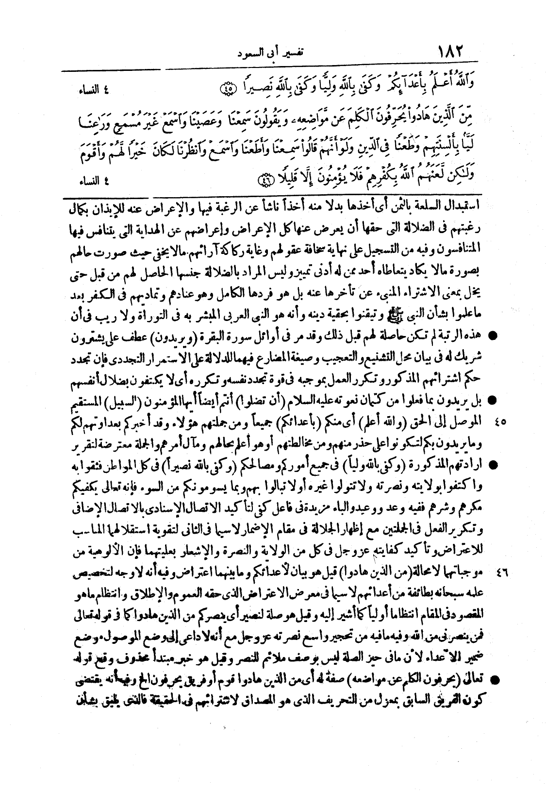 45 - 46 النساء استبدال السلعة بالثمن أي أخذِها بدلاً منه أخذاً ناشئاً عن الرغبة فيها والإعراضِ عنه للإيذان بكمال رغبتِهم في الضلالة التي حقُّها أن يُعرَضَ عنها كلَّ الإعراضِ وإعراضِهم عن الهداية التي يتنافسُ فيها المتنافسونَ وفيه من التسجيل على نهاية سخافةِ عقولِهم وغايةِ ركاكةِ آرائِهم ما لا يَخفْى حيثُ صُوِّرت حالُهم بصورة ما لا يكادُ يتعاطاه أحدٌ ممن له أدنى تمييزٍ وليس المرادُ بالضلالة جنسَها الحاصلَ لهم من قبلُ حتى يخل بمعنى الاشتراء المنبئ عن تأخُّرِها عنه بل هو فردُها الكاملُ وهو عنادُهم وتماديهم في الكفر بعد ما علموا بشأن النبيِّ صلَّى الله عليهِ وسلم وتيقنوا بحقِّية دينه وأنه هو النبيُّ العربيُّ المبشَّرُ به في التوراة ولا ريب في أن هذه الرتبةَ لم تكن حاصلةً لهم قبل ذلك وقد مرَّ في أوائل سُورة البقرة