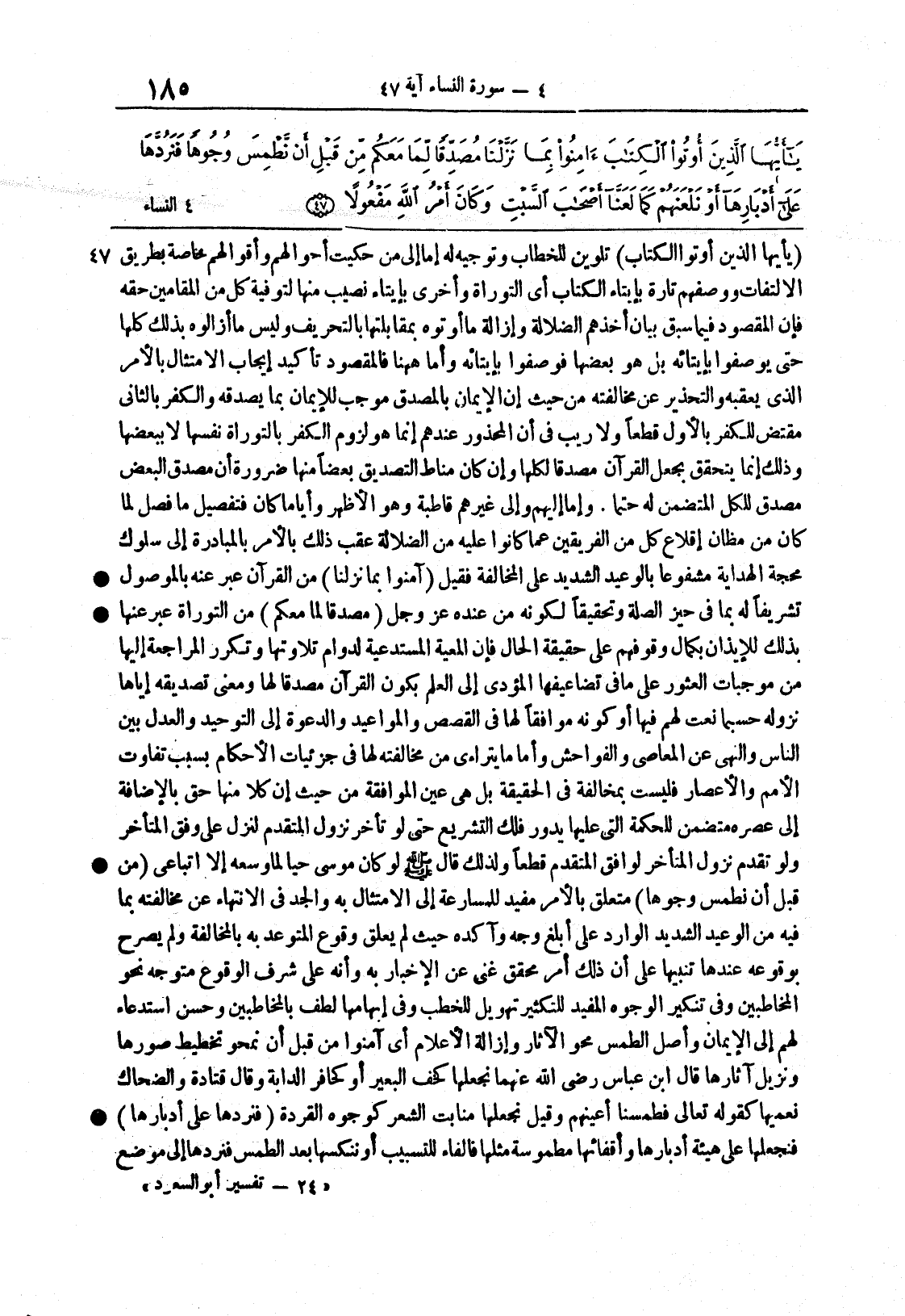{يا أيها الذين أُوتُواْ الكتاب} تلوينٌ للخطاب وتوجيهٌ له إما إلى من حُكِيتْ أحوالُهم وأقوالُهم خاصةً بطريق الالتفاتِ ووصفُهم تارةً بإيتاء الكتابِ أي التوراةِ وأخرى بإيتاء نصيبٍ منها لتوفية كلَ من المقامَين حقَّه فإن المقصودَ فيما سبق بيانُ أخذِهم الضلالةَ وإزالةُ ما أُوتوه بمقابلتها بالتحريف وليس ما أزالوه بذلك كلَّها حتى يوصَفوا بإيتائه بل هو بعضُها فوُصِفوا بإيتائه وأما ههنا فالمقصودُ تأكيدُ إيجابِ الامتثالِ بالأمر الذي يعقُبه والتحذيرُ عن مخالفته من حيث أن الإيمانَ بالمصدَّق موجِبٌ للإيمان بما يصدِّقه والكفرَ بالثاني مقتضٍ للكفر بالأول قطعاً ولا ريب في أن المحذورَ عندهم إنما هو لزومُ الكفرِ بالتوراة نفسِها لا ببعضها وذلك إنما يتحقق بجعل القرآنِ مصدِّقاً لكلها وإن كان مناطُ التصديقِ بعضاً منها ضرورةَ أن مصدِّقَ البعضِ مصدَّقٌ للكل المتضمِّن له حتماً وإما إليهم وإلى غيرهم قاطبةً وهو الأظهر وأياما كان فتفصيلُ ما فُصّل لمّا كان من مظانّ إقلاعِ كل من الفريقين عمَّا كانوا عليه من الضلالة عقّب ذلك بالأمر بالمبادرة إلى سلوك محَجّة الهدايةِ مشفوعاً بالوعيد الشديدِ على المخالفة فقيل