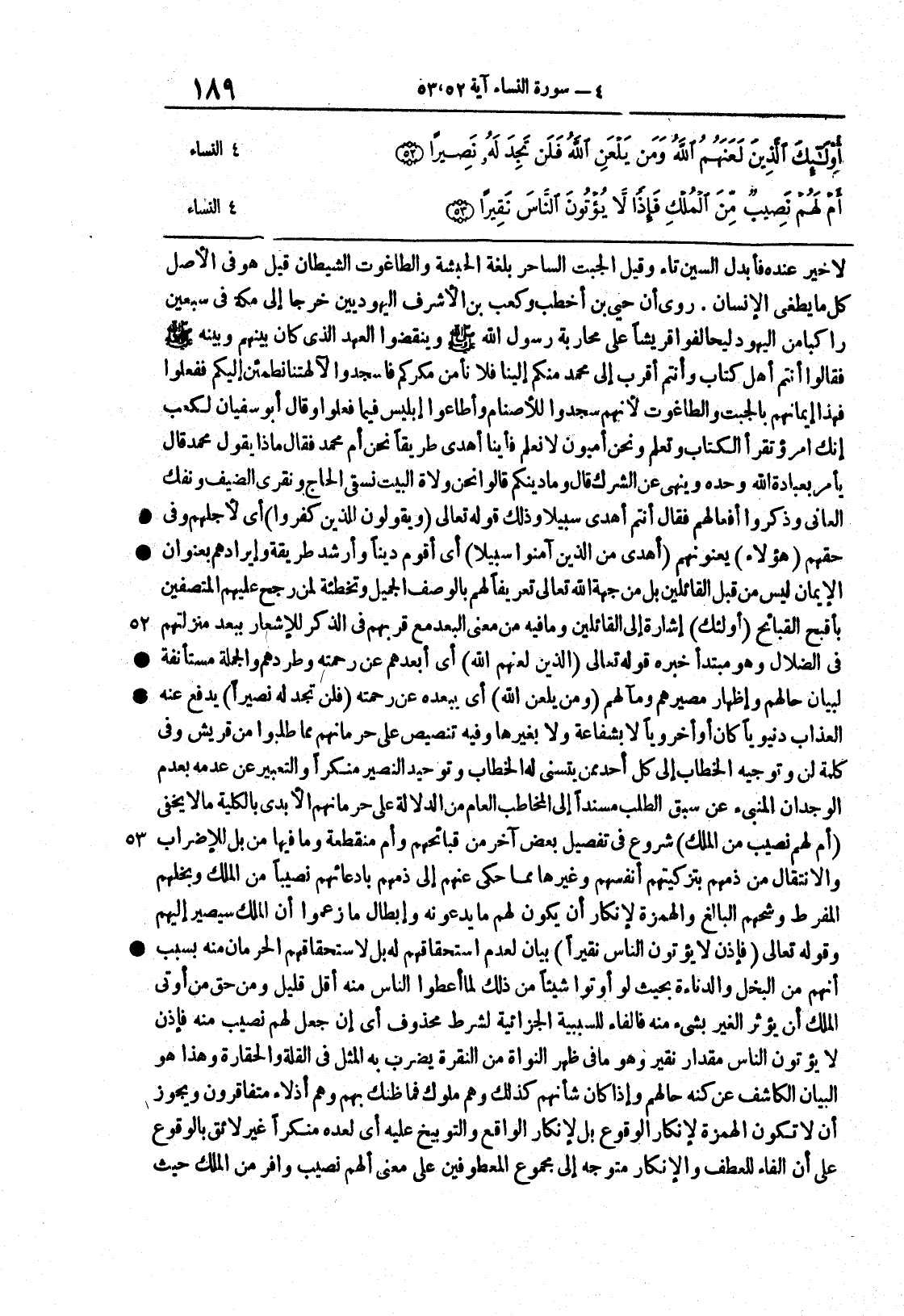 52 - 53 النساء لاخير عنده فأبدل السين تاءً وقيل الجبتُ الساحرُ بلغة الحبشة والطاغوتُ الشيطانُ قيل هو في الأصل كل ما يُطغي الإنسان روي أن حُيَيَّ بنَ أخطبَ وكعبَ بنَ الأشرف اليهوديين خرجا إلى مكةَ في سبعين راكباً من اليهود ليحالفوا قريشاً على محاربة رسول الله صلى الله عليه وسلم وينقُضوا العهدَ الذي كان بينهم وبينه صلى الله عليه وسلم فقالوا أنتم أهل الكتاب وأنتم أقربُ إلى محمد منكم إلينا فلا نأمن مكركم فاسجدوا لآلهتنا نطمئنَّ إليكم ففعلوا فهذا إيمانُهم بالجبت والطاغوتِ لأنهم سجدوا للأصنام وأطاعو إبليسَ فيما فعلوا وقال أبو سفيانَ لكعبٍ إنك امرُؤٌ تقرأ الكتابَ وتعلم ونحن أُميون لا نعلم فأيُنا أهدى طريقاً نحن أم محمدٌ فقال ماذا يقول محمد قال يأمر بعباة الله وحدَه وينهي عن الشرك قال ومادينكم قالوا نحن ولاةُ البيتِ نسقى الحاج ونقرئ الضيفَ ونفُكّ العانيَ وذكروا أفعالَهم فقال أنتم أهدى سبيلاً وذلك قولُه تعالى