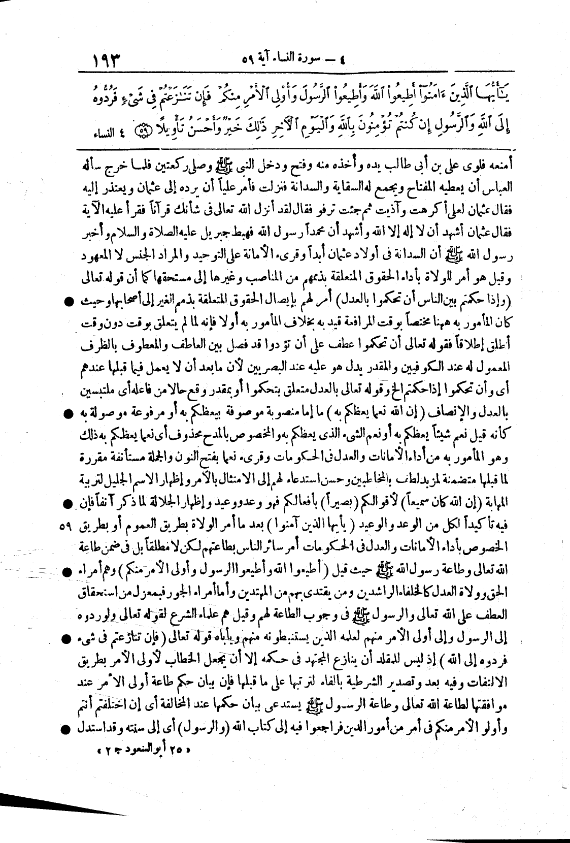 59 - النساء أمنعْه فلوى عليُّ بنُ أبي طالبٍ يدَه وأخذه منه وفتح ودخل النبيُّ صلَّى الله عليهِ وسلم وصلى ركعتين فلما خرج سأله العباسُ أن يُعطِيَه المفتاحَ ويجمعَ له السِقاية والسِدانة فنزلت فأمر علياً أن يُردَّه إلى عثمانَ ويعتذرَ إليه فقال عثمان لعليّ أكرهتَ وآذيتَ ثم جئت ترفو فقال لقد أنزل الله تعالى في شأنك قرآناً فقرأ عليه الآية فقال عثمانُ أشهدُ أَن لاَّ إلَه إِلاَّ الله وأشهدُ أنَّ محمداً رسول الله فهبَط جبريلُ عليه الصلاة والسلام وأخبر رسمل الله صلى الله عليه وسلم أن السِّدانةَ في أولاد عثمان أبدا وقرئ الأمانةَ على التوحيد والمرادُ الجنسُ لا المعهودُ وقيل هو أمرٌ للولاة بأداء الحقوقِ المتعلقةِ بذمهم من المناصب وغيرها إلى مستحقها كما أن قوله تعالى