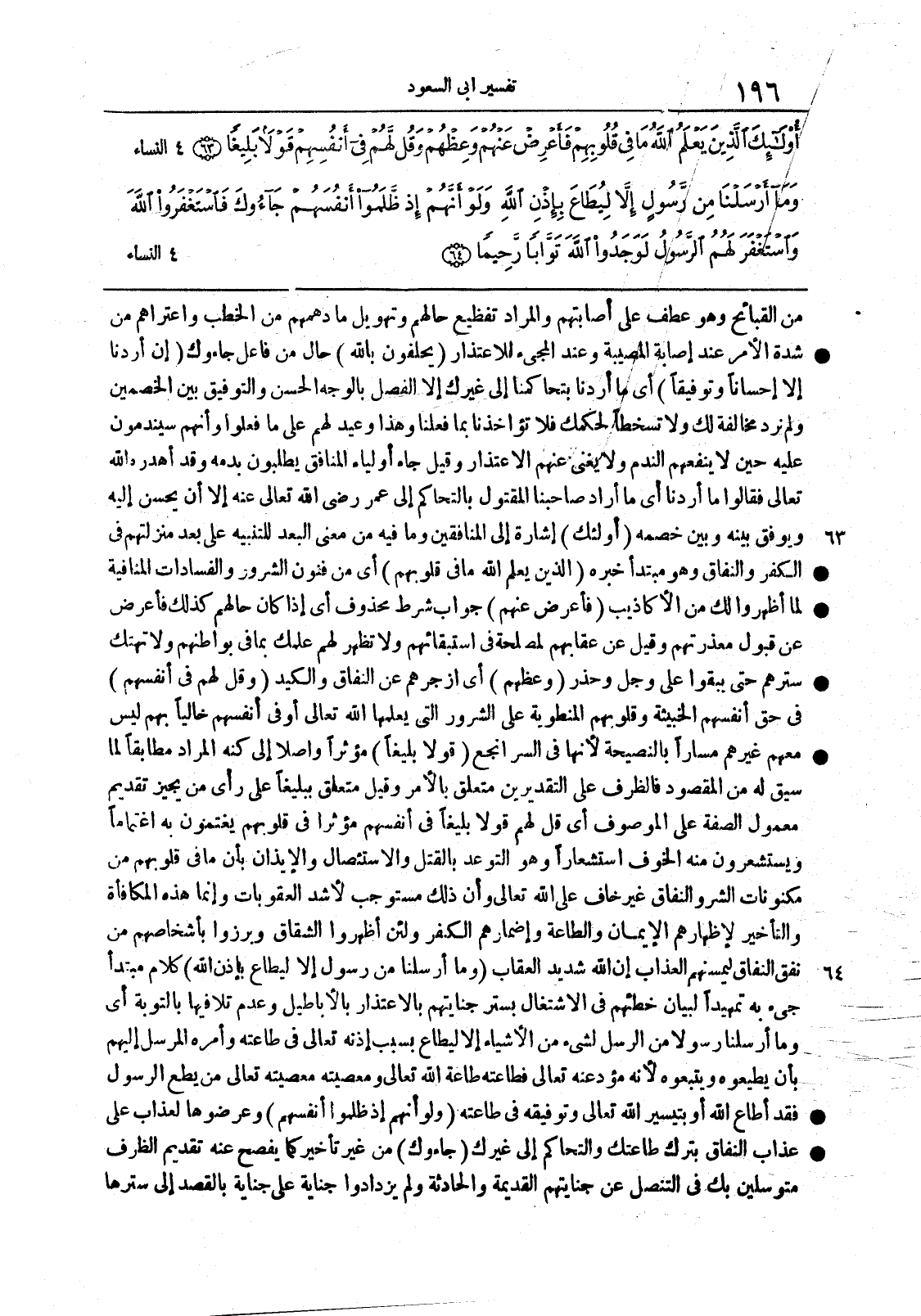 63 - 64 النساء من القبائح وهو عطفٌ على أصابتهم والمرادُ تفظيعُ حالهم وتهويل مادهمهم من الخطب واعتراهم من شدة الأمرِ عند إصابةِ المصيبة وعند المجئ للاعتذار