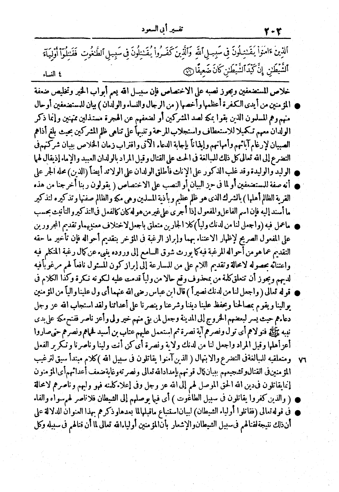 76 - النساء خلاص المستضعفين ويجوز نصبُه على الاختصاص فإن سبيلَ الله يعُمّ أبوابَ الخيرِ وتخليص ضعفه المؤمنين من أيدي الكفرةِ أعظمُها وأخصُّها