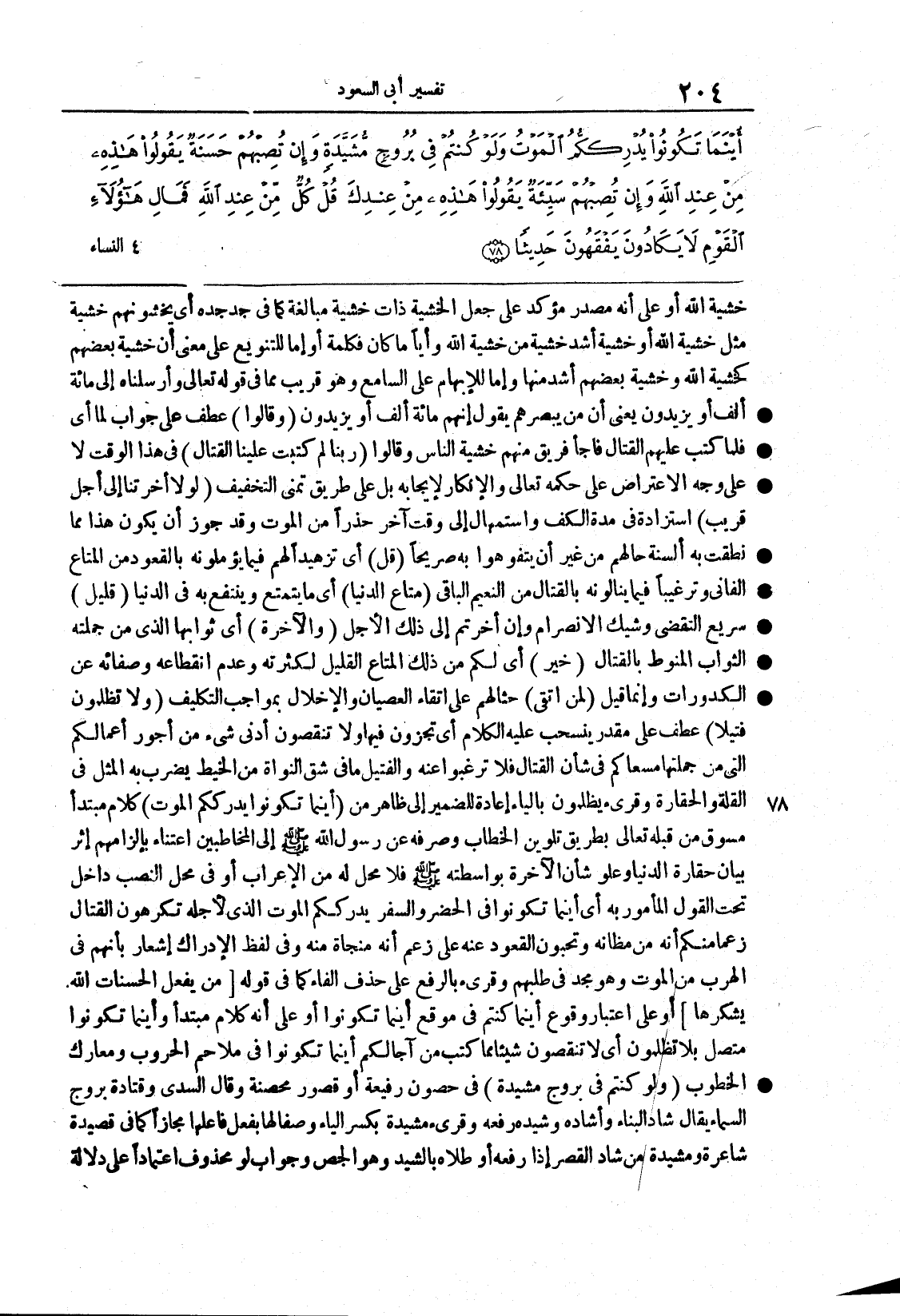 78 - النساء خشيةِ الله أو على أنَّه مصدرٌ مؤكدٌ على جعل الخشيةِ ذاتَ خشيةٍ مبالغةً كما في جدّ جِدُّه أي يخشَوْنهم خشيةً مثلَ خشيةِ الله أو خشيةً أشدَّ خشيةً من خشية الله وأياً ما كان فكلمةُ أو إما للتنويع على معنى أن خشيةَ بعضِهم كخشية الله وخشيةَ بعضِهم أشدُّ منها وإما للإبهام على السامع وهو قريبٌ مما في قوله تعالى وأرسلناه إلى مِاْئَةِ أَلْفٍ أو يزيدون يعني أن من يبصرهم يقول إنَّهم مائةِ ألفٍ أو يزيدونَ