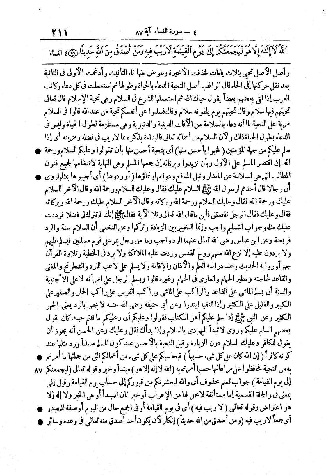 87 - النساء وأصلُ الأصلِ تَحْيِيٌّ بثلاث ياءاتٍ فحُذفت الأخيرةُ وعُوِّضَ عنها تاءُ التأنيثِ وأُدغمت الأولى في الثانية بعد نقلِ حركتِها إلى الحاء قال الراغبُ أصلُ التحية الدعاءُ بالحياة وطولِها ثم استعملت في كل دعاءٍ وكانت العربُ إذا لقِيَ بعضُهم بعضاً يقول حياك الله ثم استعملها الشرعُ في السلام وهي تحيةُ الإسلام قال تعالى {تَحِيَّتُهُمْ فِيهَا سلام} وقال {تَحِيَّتُهُمْ يَوْمَ يَلْقَوْنَهُ سلام} وقال {فَسَلّمُواْ على أَنفُسِكُمْ تَحِيَّةً مّنْ عِندِ الله} قالوا في السلام مزيةٌ على التحية لما أنه دعاءٌ بالسلامة من الآفات الدينيةِ والدنيويةِ وهي مستلزِمةٌ لطول الحياةِ وليس في الدعاء بطول الحياةِ ذلك ولأن السلامَ من أسمائه تعالى فالبَداءةُ بذكره مما لا ريب في فضله ومزّيتِه أي إذا سُلِّم عليكم من جهة المؤمنين