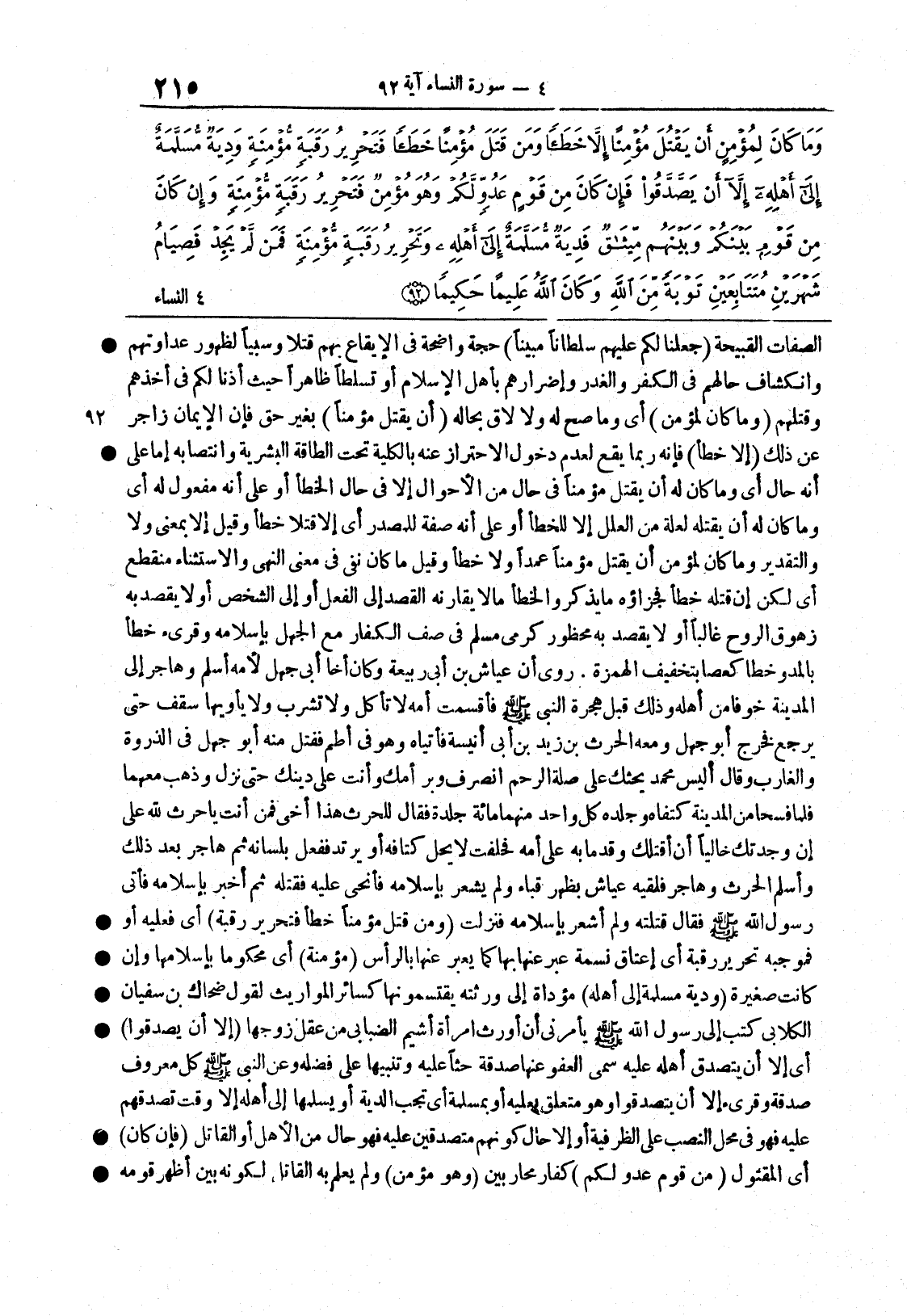 {إِلا خطأ} فإنه ربما يقع لعدم دخولِ الاحترازِ عنه بالكلية تحت الطاقةِ البشريةِ وانتصابُه إمَّا على أنَّه حالٌ أي وما كان له أن يقتلَ مؤمناً في حالٍ من الأحوالِ إلا في حال الخطأ أو على أنَّه مفعولٌ له أي وما كان له أن يقتله لعِلّة من العلل إلا للخطأ أو على أنه صفةٌ للمصدر أي إلا قتلاً خطأً وقيل إلا بمعنى ولا والتقديرُ وما كان لمؤمن أن يقتل مؤمناً عمداً ولا خطأً وقيل مَا كَانَ نفيٌ في مَعْنى النهي والاستثناءُ منقطِعٌ أي لكنْ إن قتله خطأً فجزاؤُه ما يُذكر والخطأ مالا يقارِنه القصْدُ إلى الفعل أو إلى الشخص أولا يُقصد به زُهوقُ الروحِ غالباً أو لا يقصد به محظورٌ كرمي مُسلمٍ في صف الكفارِ مع الجهل بإسلامه وقرئ خطأ بالمد وخَطاً كعصا بتخفيف الهمزة روي أن عياشَ بنَ أبي ربيعةَ وكان أخا أبي جهلٍ لأمّه أسلم وهاجر إلى المدينة خوفاً من أهله وذلك قبل هجرة النبيِّ صلَّى الله عليهِ وسلم فأقسمَتْ أمُّه لا تأكلُ ولا تشربُ ولا يَأْويها سقفٌ حتى يرجِع فخرج أبو جهل ومعه الحرث بنُ زيدِ بنِ أبي أنيسةَ فأتياه وهو في أطم ففتل منه أبو جهل في الذُّروة والغارب وقال أليس محمدٌ يحثُّك على صلة الرحِمِ انصرِفْ وبَرَّ أمَّك وأنت على دينك حتى نزل وذهب معهما فلما فسَحا من المدينة كتفاه وجلده فقال للحرث هذا أخي فمن أنت يا حرث لله علي إن وجدتك خالياً أن أقتلَك وقدِما به على أمه فحلفت لا يُحَلُّ كِتافُه أو يرتدَّ ففعل بلسانه ثم هاجر بعد ذلك وأسلم الحرث وهاجر فلقِيَه عياشُ بظهر قُباءَ ولم يشعُرْ بإسلامه فأنحى عليه فقتله ثم أُخبر بإسلامه فأتى رسولَ الله صلى الله عليه وسلم فقال قتلتُه ولم أشعُرْ بإسلامه فنزلت