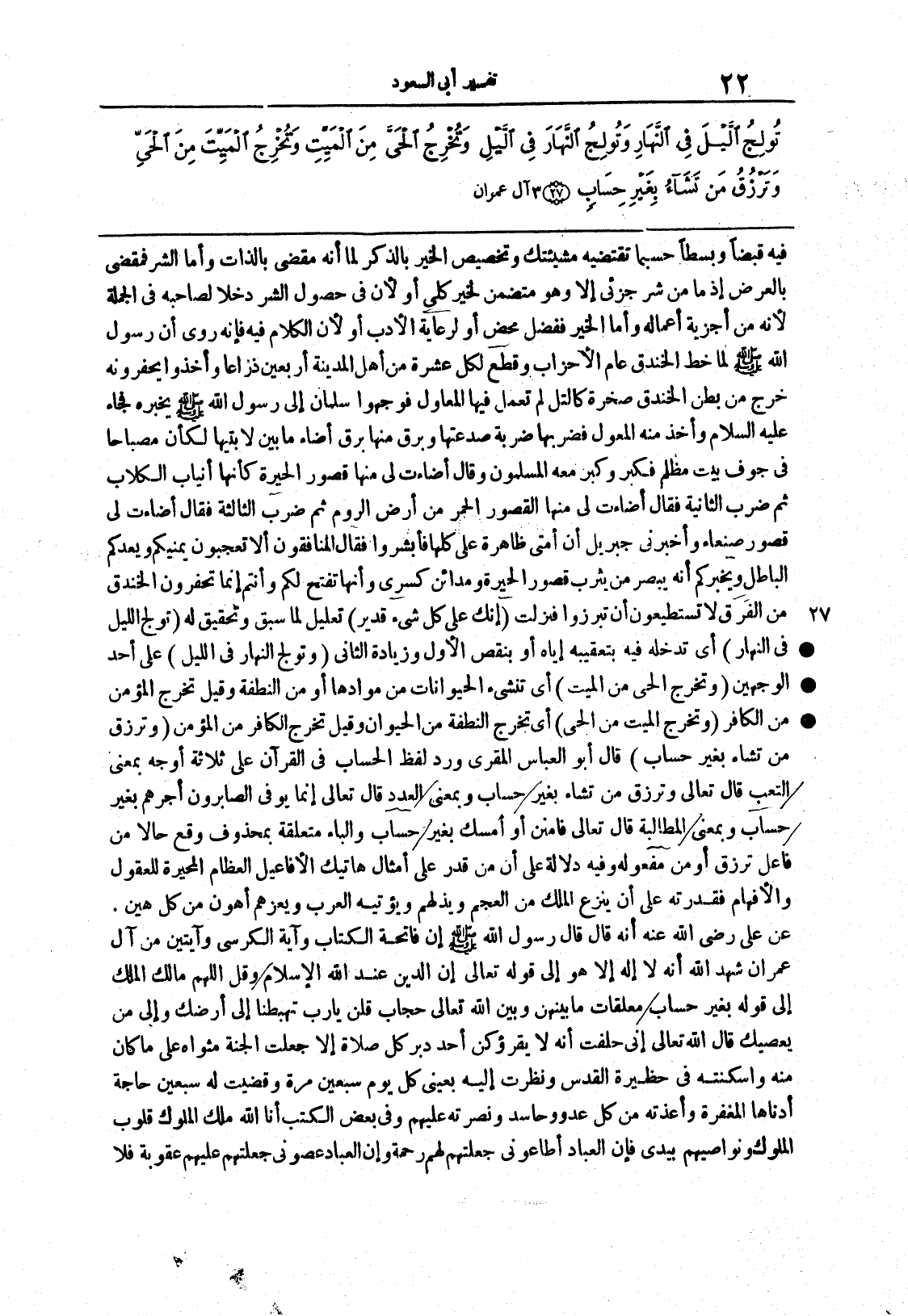 {وَتَرْزُقُ مَن تَشَاء بِغَيْرِ حِسَابٍ} قال أبو العباس المَقَّرِي ورد لفظُ الحساب في القرآن على ثلاثة أوجهٍ بمعنى التعب قال تعالى {وَتَرْزُقُ مَن تَشَاء بِغَيْرِ حِسَابٍ} وبمعنى العدد قال تعالى {إِنَّمَا يُوَفَّى الصابرون أَجْرَهُمْ بِغَيْرِ حِسَابٍ} وبمعنى المطالبة قال تعالى {فامنن أَوْ أَمْسِكْ بِغَيْرِ حِسَابٍ} والباءُ متعلقةٌ بمحذوفٍ وقعَ حالاً من فاعل ترزق أو من مفعوله وفيه دَلالةٌ على أن من قدر على أمثال هاتيك الأفاعيلِ العظامِ المحيِّرة للعقول والأفهام فقُدرته على أن ينزعَ الملكَ من العجم ويُذِلهم ويُؤتيَه العربَ ويُعِزَّهم أهونُ من كل هيّن عن عليَ رضيَ الله عنه أنه قال قالَ رسولُ الله صلى الله عليه وسلم إن فاتحة الكتاب وآيةَ الكرسيِّ وآيتين من آل عمران شهد الله أَنَّهُ لاَ إله إِلا هو إلى قوله تعالى إِنَّ الدين عند الله الإسلام وقل اللهم مالك الملك إلى قوله بِغَيْرِ حِسَابٍ معلقاتٌ ما بينهن وبين الله تعالى حجابٌ قلن يا رب تُهبِطُنا إلى أرضك وإلى من يعصيك قال الله تعالى إني حلفت أنه لا يقرؤكُنّ أحدٌ دُبُرَ كُلِّ صلاةٍ إلا جعلتُ الجنّةَ مثواه على ما كان منه وأسكنتُه في حظيرة القدس ونظرت اليه بعيني كل يوم سبعين مرةً وقضيتُ له سبعين حاجة أدناها المغفرة وأعذتُه من كل عدو وحاسدٍ ونصرتُه عليهم وفي بعض الكتب أنا الله ملكُ الملوك قلوبُ الملوكِ ونواصِيهم بيدي فإنِ العبادُ أطاعوني جعلتهم لهم رحمة وإنِ العبادُ عصَوْني جعلتهم عليهم عقوبة فلا