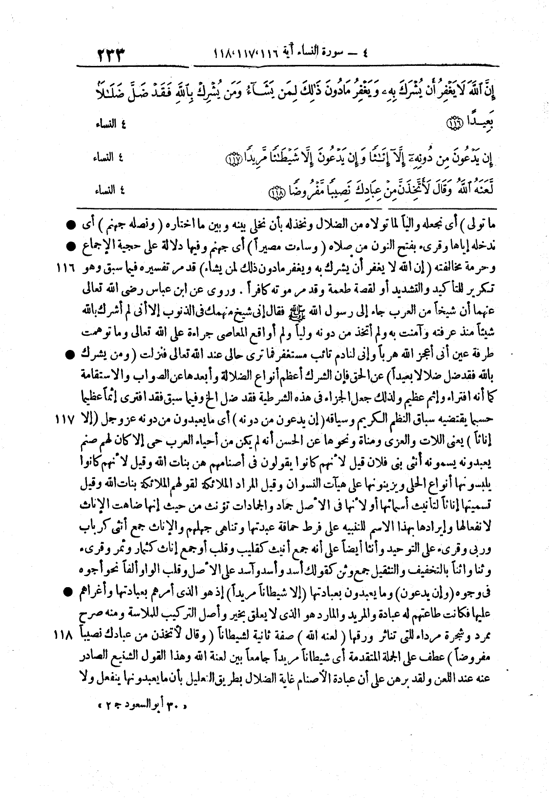 {إِلاَّ إناثا} يعني اللاتَ والعُزَّى ومناةَ ونحوَها عن الحسن أنه لم يكن من أحياء العربِ حيٌّ إلا كان لهم صنمٌ يعبُدونه يسمُّونه أنثى بني فلان قيل لأنهم كانوا يقولون في أصنامهم هن بناتُ الله وقيل لأنهم كانوا يُلْبِسونها أنواعَ الحَلْي ويزينونها على هيآت النِّسوانِ وقيل المرادُ الملائكةُ لقولهم الملائكةُ بناتُ الله وقيل تسميتُها إناثاً لتأنيث أسمائِها أو لأنها في الأصل جمادٌ والجماداتُ تؤنَّثُ من حيث أنها ضاهت الإناثَ لانفعالها وإيرادُها بهذا الاسم للتنبيه على فرط حماقةِ عَبَدتِها وتناهي جهلِهم والإناثُ جمع أنثى كرِباب وربى وقرئ على التوحيد وأُنُثاً أيضاً على أنه جمع أنيث كقليب وقلُب أو جمع إناث كثمار وثمر وقرئ وثنا واثنا بالتخفيف والتثقيل جمع وثن كقولك أسد وأسد وآسد على الأصل وقلبِ الواو ألفاً نحو أُجوه في وجوه