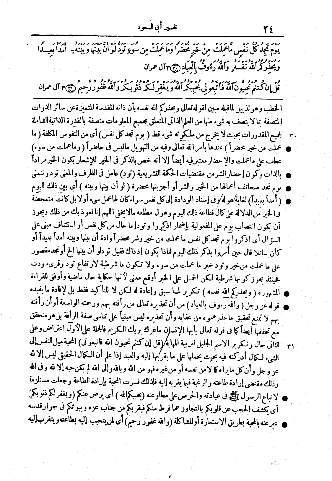 {أَمَدَا بَعِيدًا} لغاية هولة وفي إسناد الودادة إلى كل نفس سواءٌ كان لها عمل سئ أو لا بل كانت متمحِّضةً في الخير من الدلالةِ عَلى كمالِ فظاعةِ ذلك اليوم وهول مطلعِه مالا يخفى اللهم إنا نعوذ بك من ذلكَ ويجوزُ أنْ يكون انتصابُ يومَ على المفعولية بإضمار اذكروا وتودّ إما حال من كل نفس أو استئنافٌ مبنيُّ على السؤال أي اذكروا يَوْمَ تَجِدُ كُلُّ نَفْسٍ مَّا عَمِلَتْ مِنْ خَيْرٍ شر محضراً وادّةً أن بينها وبينه أمداً بعيداً أو كأن سائلاً قال حين أمروا بذكر ذلك اليوم فماذا يكون إذ ذاك فقيل تود لو أن بينها الخ أو تَجِدُ مقصورٌ على مَّا عَمِلَتْ مِنْ خَيْرٍ وتود خبرُ ما عملت من سوء ولا تكون ما شرطية لارتفاع تود وقرئ ودّت فحينئذ يجوز كونُها شرطيةً لكن الحمل على الخبر أوقعُ معنىً لأنها حكايةُ حالً ماضية وأوفقُ للقراءة المشهورة
