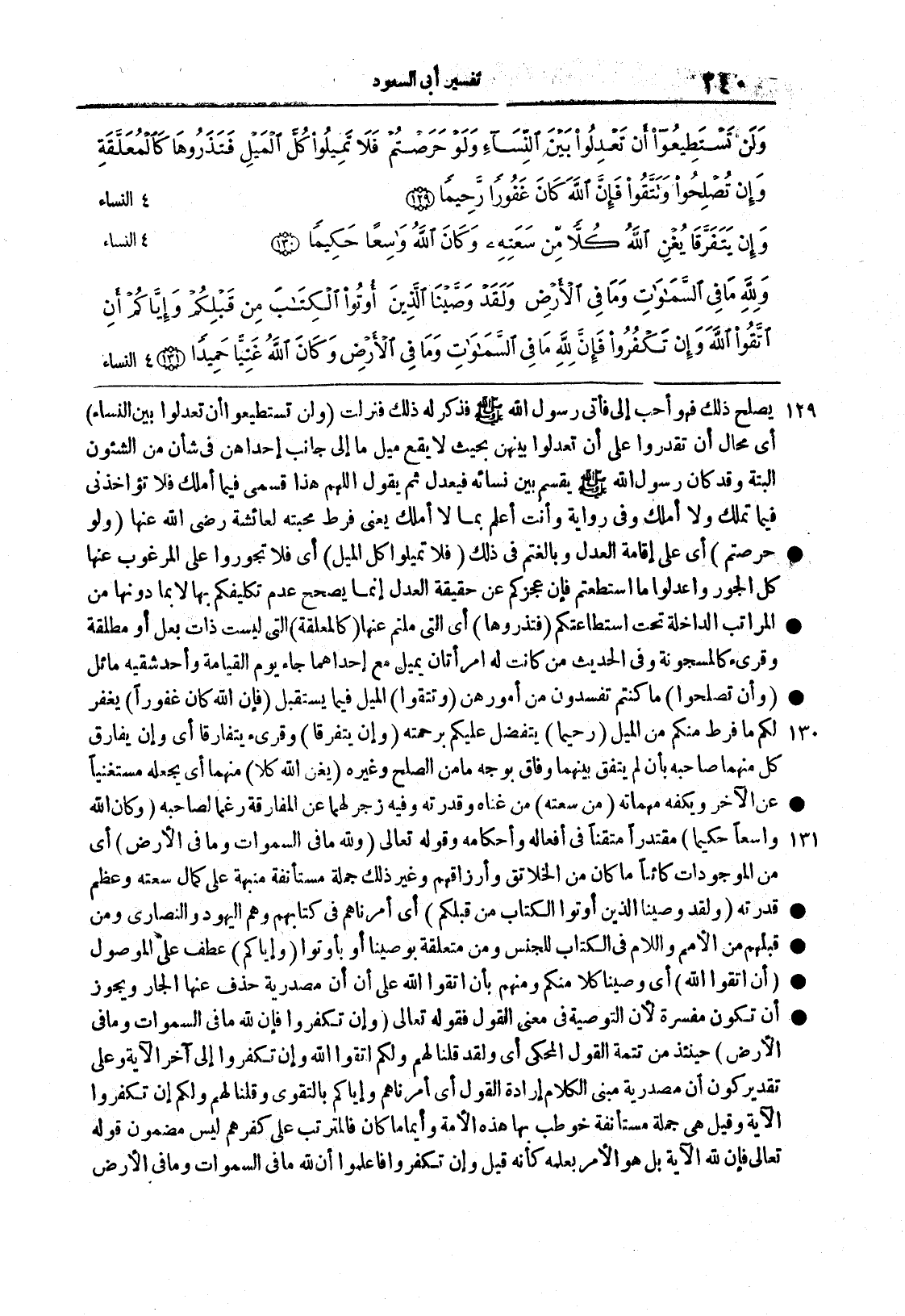 {وَلَن تَسْتَطِيعُواْ أَن تَعْدِلُواْ بَيْنَ النساء} أي مُحال أن تقدورا على أن تعدِلوا بينهن بحيث لا يقع ميلٌ ما إلى جانب إحداهن في شأن من الشئون البتةَ وقد كان رسولُ الله صلى الله عليه وسلم يقسِمُ بين نسائِه فيعدِلُ ثم يقول اللهم هذا قَسْمي فيما أملِك فلا تؤاخِذْني فيما تملِكُ ولا أملِكُ وفي رواية وأنت أعلم بما لاأملك يعني فرطَ محبتِه لعائشة رضى الله عنها