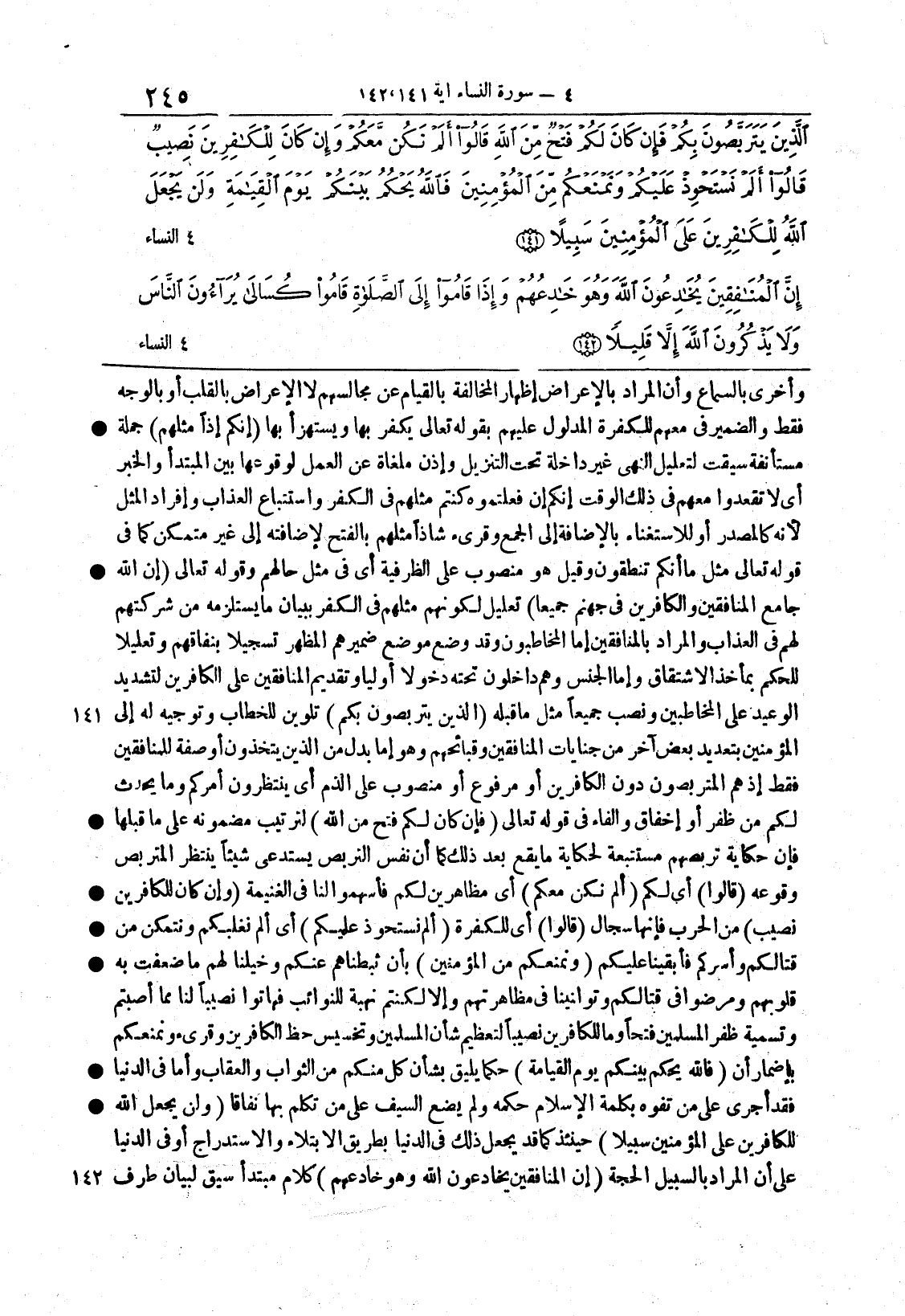 141 - 142 النساء وأخرى بالسماع وأن المرادَ بالإعراض إظهارُ المخالفةِ بالقيام عن مجالسهم لا الإعراضُ بالقلب أو بالوجه فقط والضميرُ في معهم للكفرة المدلولِ عليهم بقولِه تعالى يُكَفَرُ بِهَا وَيُسْتَهْزَأُ بِهَا