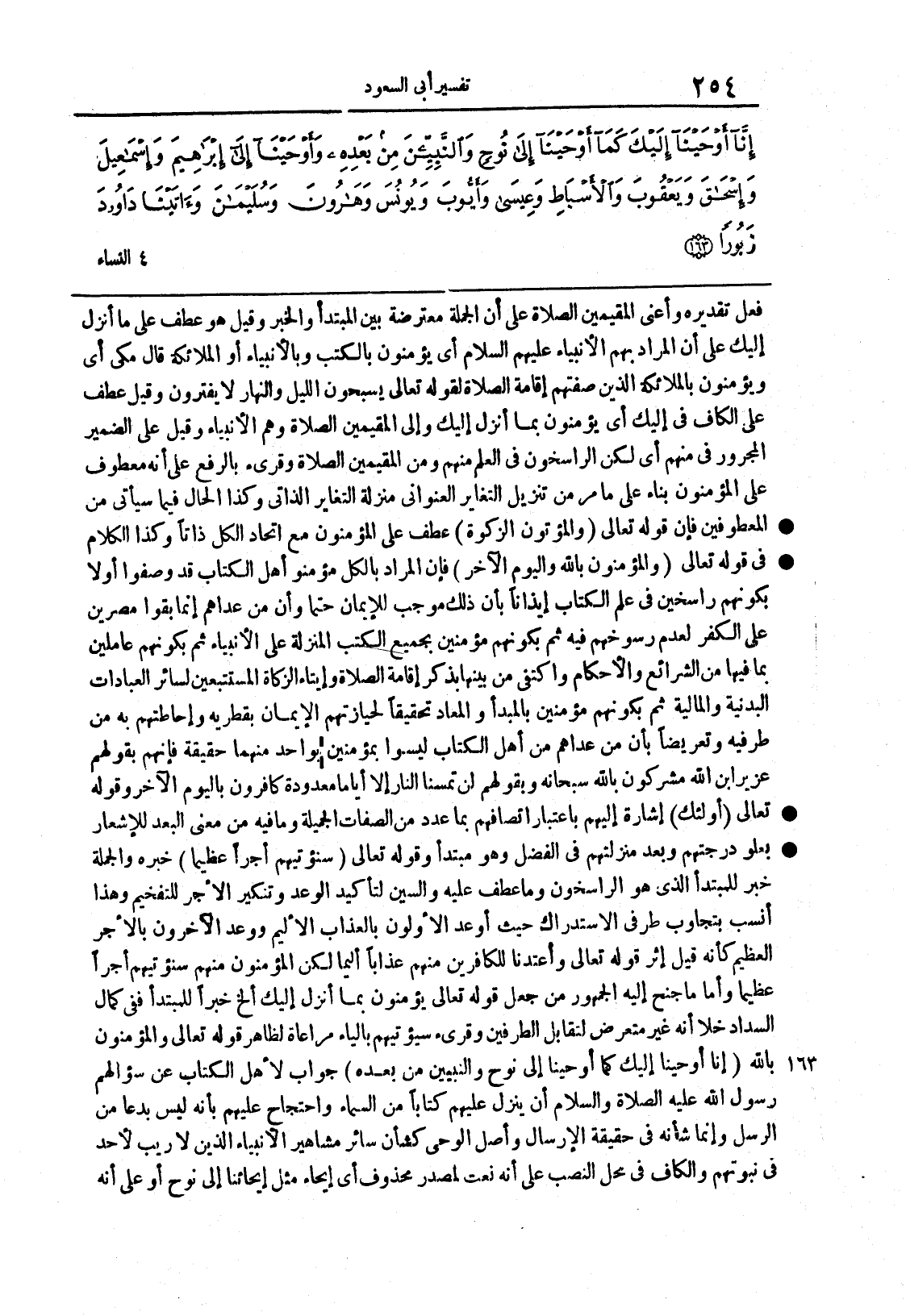 163 - النساء فعلى تقديرُه وأعني المقيمين الصلاةَ على أن الجملةَ معترضةٌ بين المبتدأ والخبرِ وقيل هُو عطفٌ على ما أزل إليك على أن المرادَ بهم الأنبياءُ عليهم السلام أي يؤمنون بالكتب وبالأنبياء أو الملائكة قال مكي أي ويؤمنون بالملائكة الذين صفتهم إثامة الصلاةِ لقوله تعالى يُسَبّحُونَ الليلَ والنهارَ لاَ يَفْتُرُونَ وقيل عطفٌ على الكافِ في إليك أي يؤمنون بما أنزل إليه وإلى المقيمين الصلاة وقرئ بالرفع على أنه معطوفٌ على المؤمنون بناءً على ما مر من تنزيل التغاير العنواني في منزلة التغاير الذاتي وكاذ الحالُ فيما سيأتي من المعطوفَين فإن قوله تعالى