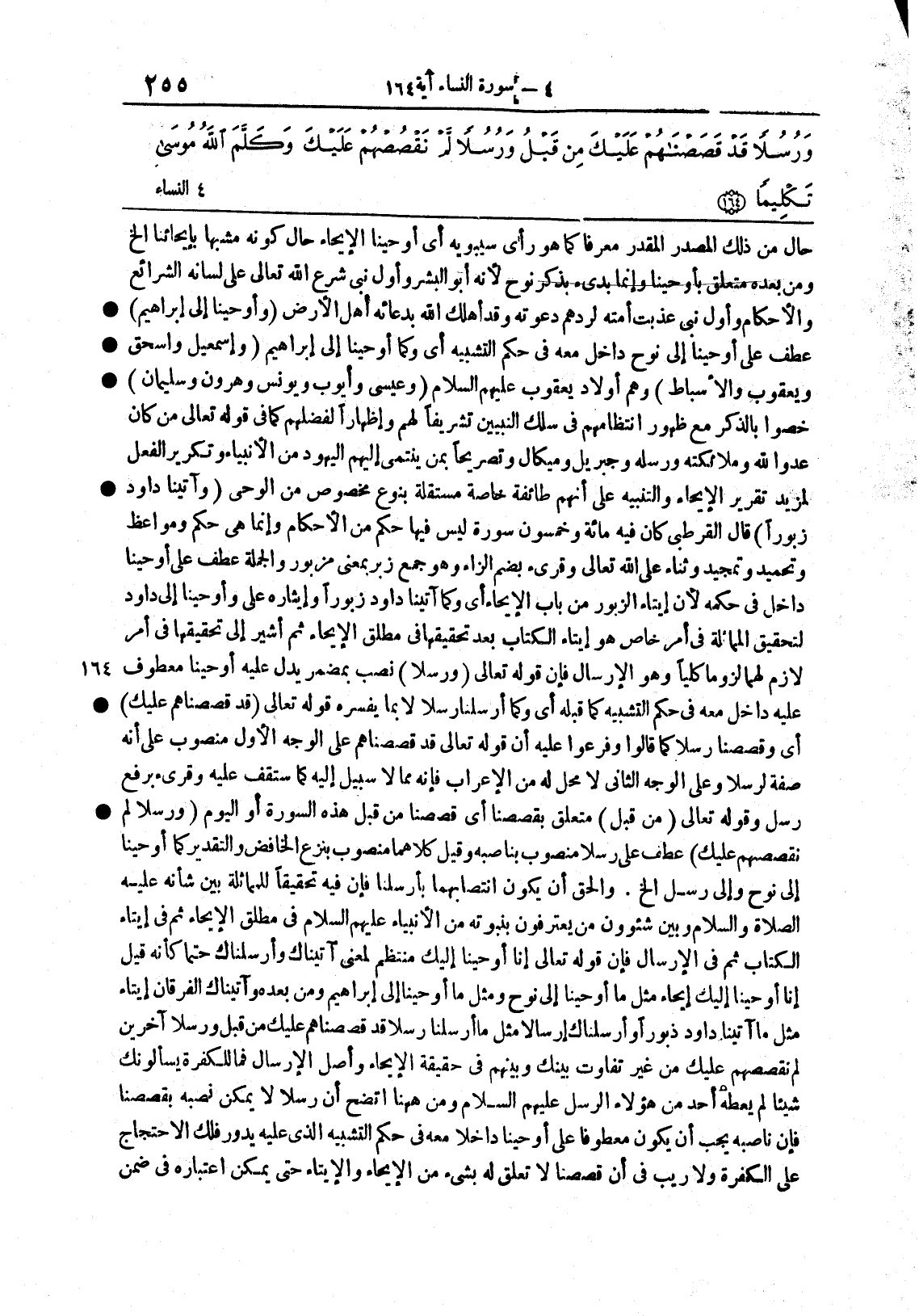 164 - النساء حالٌ من ذلك المصدرِ المقدر معرّفاً كما هُو رأيُ سيبويهِ أي أوحينا الايحاءَ حال كونِه مشبهاً بإيحائنا الخ ومن بعدِه متعلقٌ بأوحينا وإنما بدئ بذكر نوحٍ لأنه أبو البشر وأولُ نبيَ شرَع الله تعالى على لسانه الشرائعَ والأحكامَ وأولُ نبيَ عُذّبت أمتُه لردهم دعوتَه وقد أهلك الله بدعائه أهلَ الأرضِ