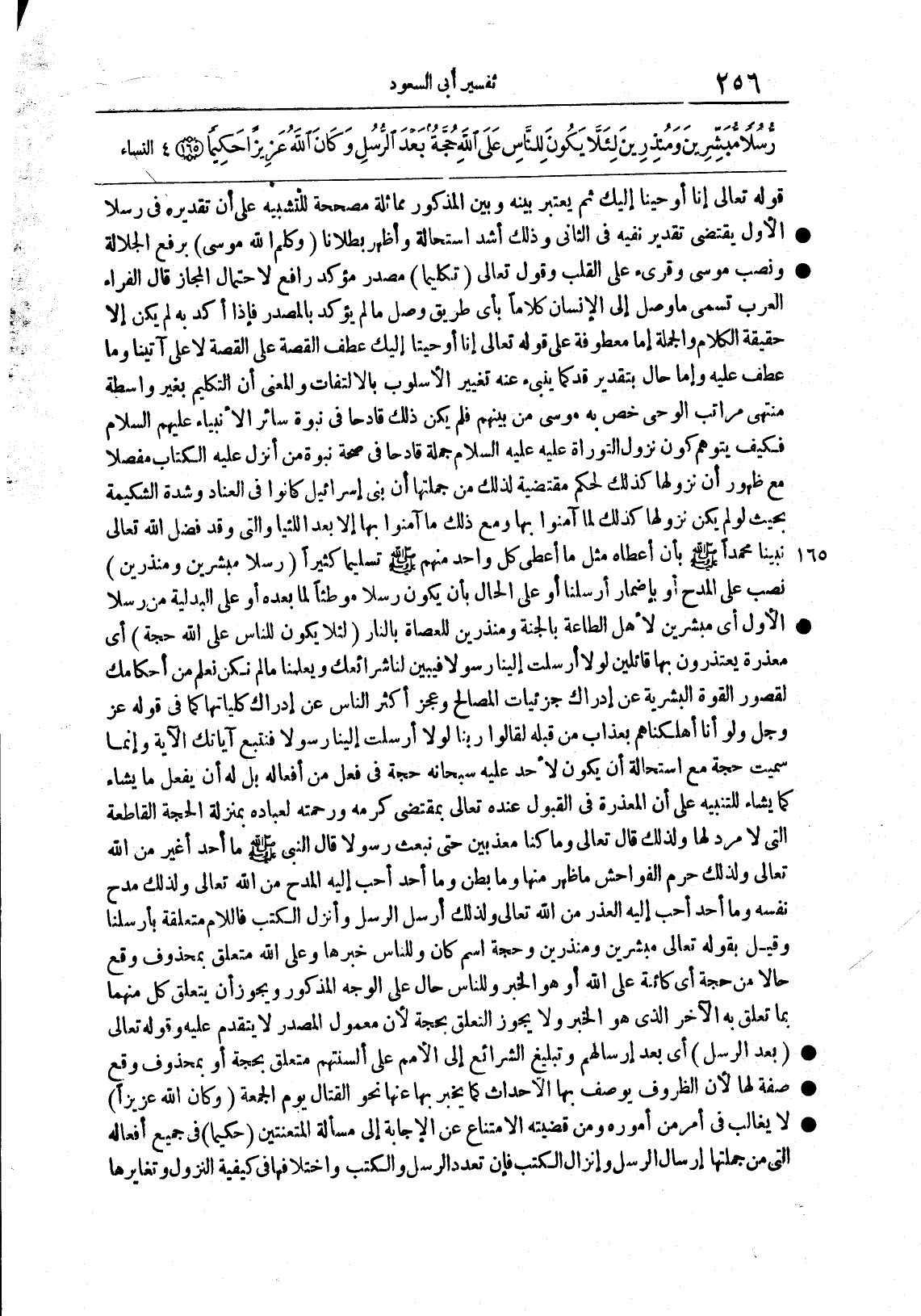 165 - النساء قوله تعالى إِنَّا أَوْحَيْنَا إِلَيْكَ ثم يعتبرُ بينه وبين المذكورِ مماثلةٌ مصحِّحةٌ للتشبيه على أن تقديرَه في رسلاً الأوّلِ يقتضي تقديرَ نفيِه في الثاني وذلك أشدُّ استحالةً وأظهرُ بطلاناً