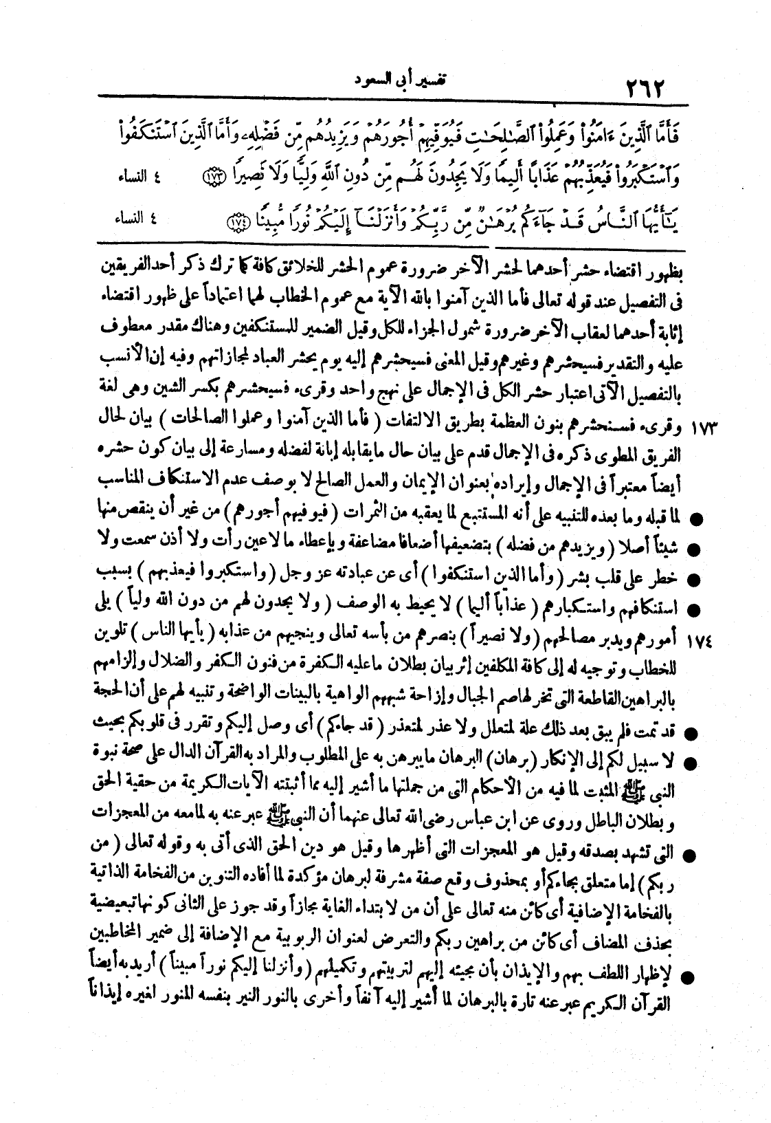 173 - 174 النساء بظهور اقتضاءِ حشرِ أحدِهما لحشر الآخرِ ضرورةَ عمومِ الحشرِ للخلائق كافةً كما تُرك ذكرُ أحدِ الفريقين في التفصيل عند قوله تعالى فَأَمَّا الذين آمنوا بالله الآية مع عموم الخطابِ لهما اعتماداً على ظهور اقتضاءِ إثابةِ أحدِهما لعقاب الآخر ضرورةَ شمولِ الجزاءِ للكل وقيل الضميرُ للمستنكفين وهناك مقدر اقتضاءِ إثابةِ أحدِهما لعقاب الآخر ضرورةَ شمولِ الجزاءِ للكل وقيل الضميرُ للمستنكِفين وهناك مقدَّرٌ معطوفٌ عليه والتقدير فسيحشرهم وغيرهم وقيل المعنى فسيحشرهم إليه يوم يحشرُ العبادَ لمجازاتهم وفيه أن الأنسبَ بالتفصيلِ الآتي اعتبارُ حشرِ الكلِّ في الإجمال على نهج واحد وقرئ فسيحشرهم بنونِ العظمةِ بطريقِ الالتفاتِ