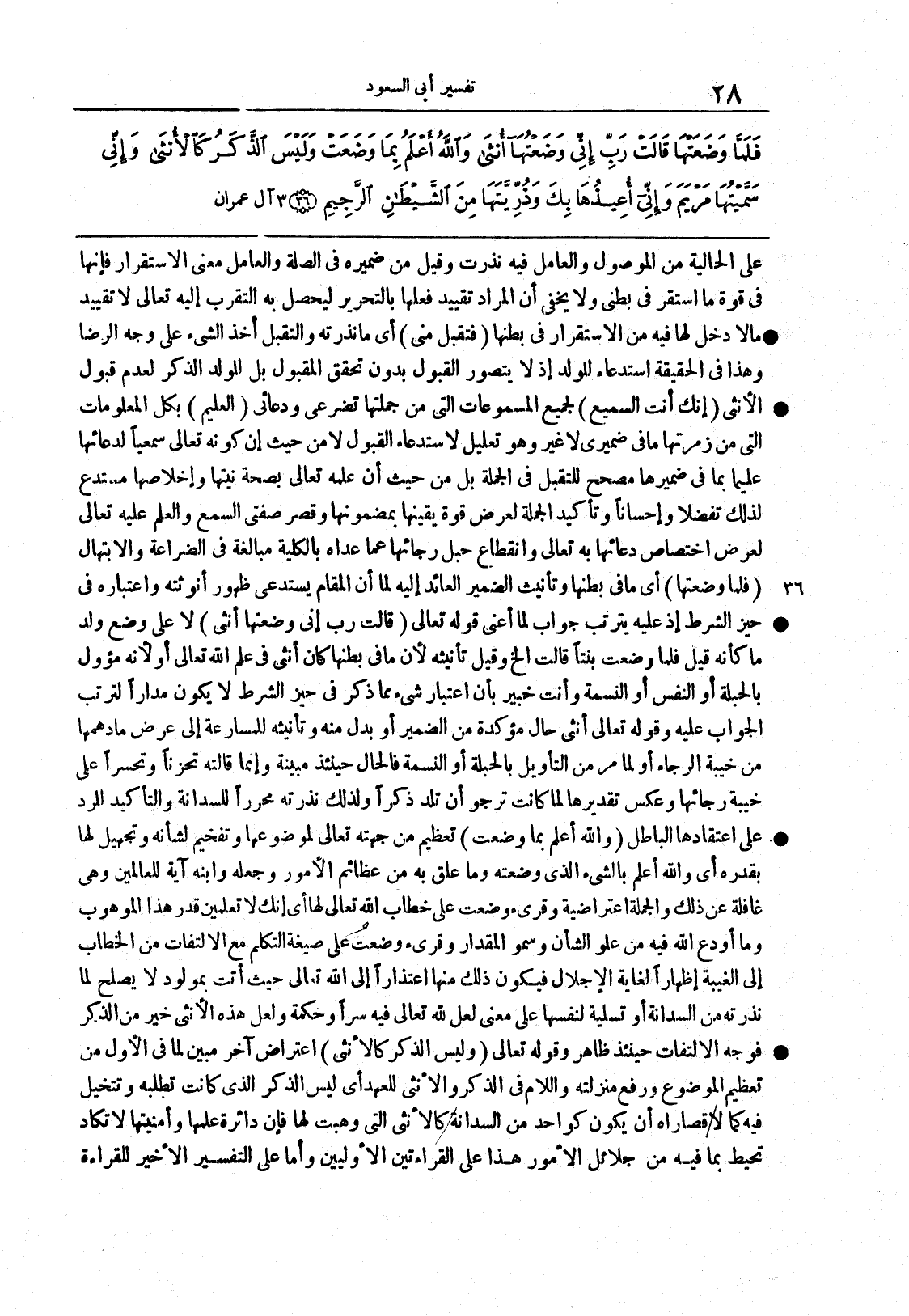 {قَالَتْ رَبّ إِنّى وَضَعْتُهَا أنثى} لا على وضع ولدٍ ما كأنه قيل فلما وضعت بنتاً قالت الخ وقيل تأنيثُه لأن ما في بطنها كان أنثى في علم الله تعالى أو لأنه مؤول بالحبلة أو النفْس أو النَّسَمة وأنت خبير بأن اعتبارَ شئ مما ذُكر في حيَّزِ الشرطِ لا يكون مداراً لترتب الجواب عليه وقولُه تعالى أنثى حال مؤكّدة من الضمير أو بدلٌ منه وتأنيثُه للمسارعة إلى عَرْض ما دَهَمها من خيبة الرجاء أو لما مر من التأويل بالحبْلةِ أو النسمة فالحال حينئذ مبيِّنة وإنما قالته تحزُّناً وتحسّراً على خيبة رجائِها وعكسِ تقديرِها لما كانت ترجو أن تلدَ ذكَراً ولذلك نذرَتْه محرّراً للسِّدانة والتأكيد المرد على اعتقادها الباطل