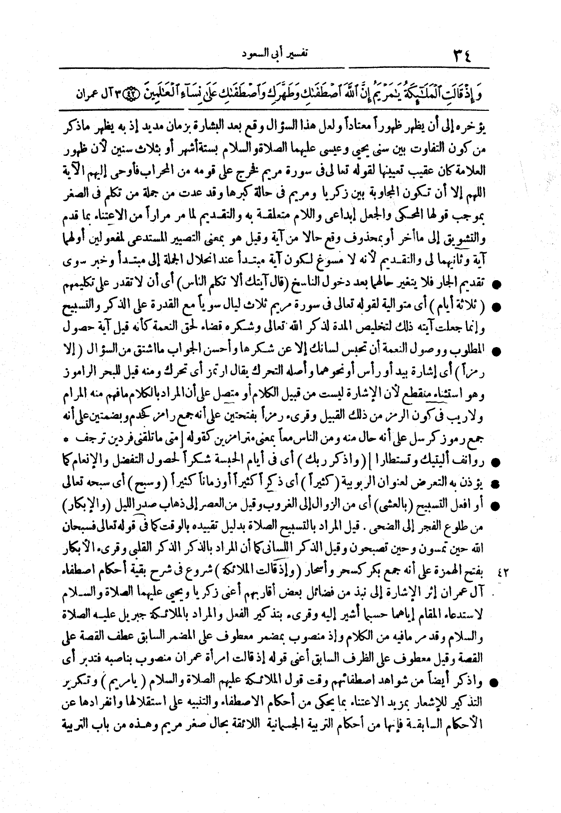 {وإذ قالت الملائكة} شروعٌ في شرح بقيةِ أحكامِ اصطفاء آلِ عمران إثرَ الإشارةِ إلى نُبَذٍ من فضائل بعضِ أقاربهم أعني زكريا ويحيى عليهما الصلاة والسلام لاستدعاء المقامِ إياهما حسبما أشير إليه وقرئ بتذكير الفعل والمرادُ بالملائكة جبريل عليه الصلاةُ والسلامُ وقد مرَّ ما فيه من الكلام وإذ منصوبٌ بمُضمر معطوفٍ على المُضمر السابق عطفَ القِصة على القصة وقيل معطوفٌ على الظرف السابق أعني قولَه إذ قالت أمرأة عمران منصوبٌ بناصبة فتدبرْ أي واذكر أيضاً من شواهد اصطفائِهم وقتَ قولِ الملائكةِ عليهم الصلاة والسلام