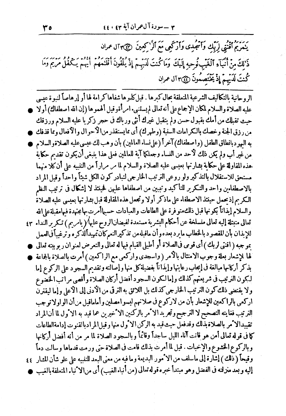 {واسجدى واركعى مع الراكعين} أُمِرت بالصلاة بالجماعة بذكر أركانها مبالغةً في إيجاب رعايتها وإيذاناً بفضيلة كلَ منها وأصالتِه وتقديمُ السجود على الركوع إما لكون الترتيب في شريعتهم كذلك وإما لكون السجودِ أفضلَ أركانِ الصلاة وأقصى مراتبِ الخضوع ولا يقتضي ذلك كونَ الترتيب الخارجيِّ كذلك بل اللائقُ به الترقي من الأدنى إلى الأعلى وإما لِيَقْترِن اركعي بالراكعين للإشعار بأن من لا ركوعَ في صلاتهم ليسوا مصلّين وأما ما قيل من أن الواوَ لا توجب الترتيبَ فغايتُه التصحيحُ لا الترجيح وتجريدُ الأمر بالرُكنين الأخيرين عما قُيِّد به الأولُ لما أن المراد تقييدُ الأمر بالصلاة بذلك وقد فعل حيث قيد به الركن الأول منها وقيل المرادُ بالقنوت إدامةُ الطاعات كما في قوله تعالى أَمَّنْ هُوَ قانت آناء الليل ساجدا وَقَائِماً وبالسجود الصلاةُ لما مر من أنه أفضلُ أركانها وبالركوع الخشوعُ والإخباتُ قيل لمّا أُمِرَت بذلك قامت في الصلاة حتى ورِمَتْ قدَماها وسالت دماً وقيحاً