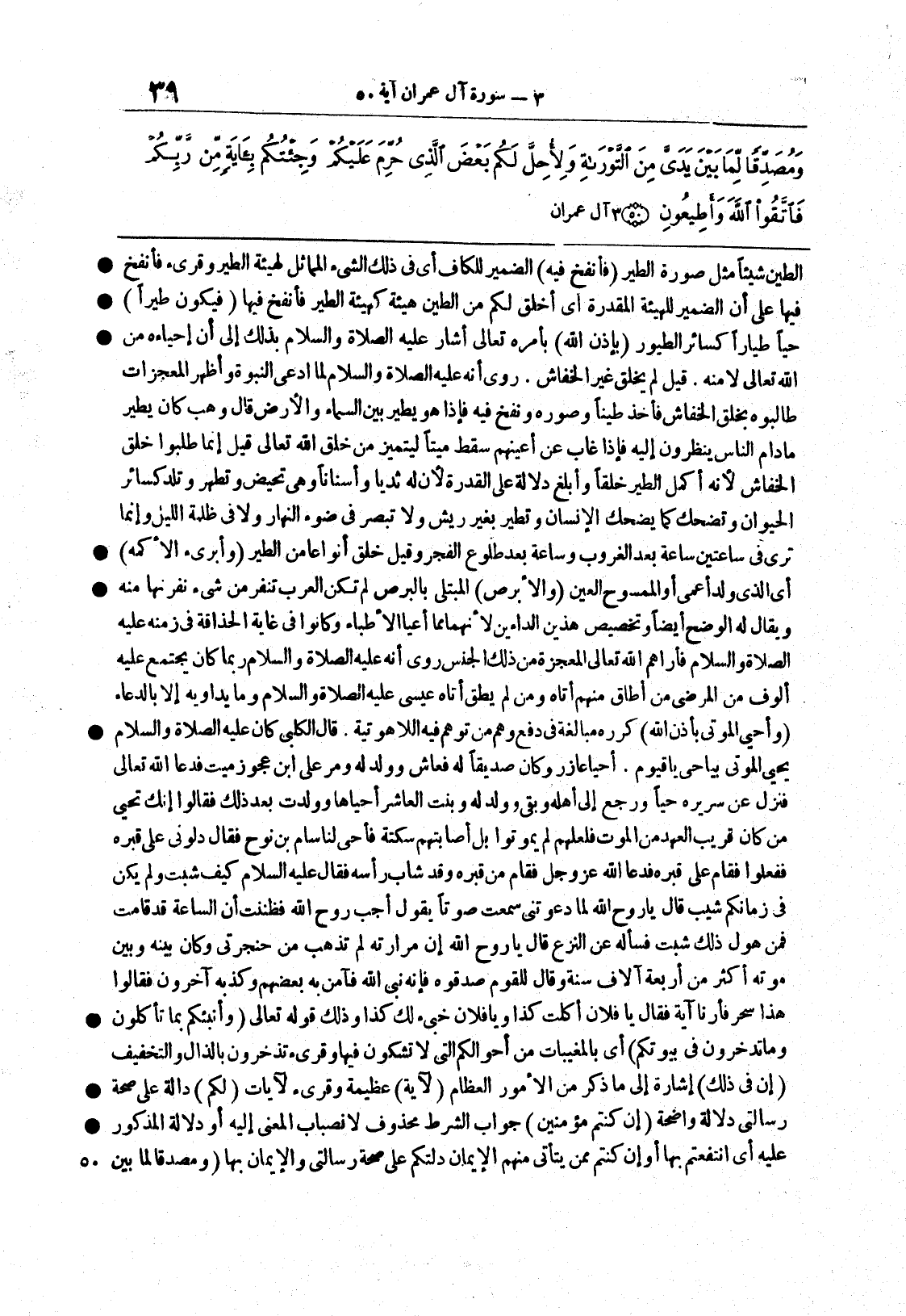 {وأحيي الموتى بإذن الله} كرَّره مبالغةً في دفع وَهْمِ مَنْ توهّم فيه اللاهوتية قال الكلبيُّ كان عليه الصَّلاةُ والسَّلامُ يُحيي الموتى بيا حيُّ يا قيُّومُ أحيا عازَرَ وكان صديقاً له فعاش وولد له ومر على ابن عجوز ميت فدعا الله تعالى فنزل عن سريره حياً ورجع إلى أهله وبقي وولد له وبنت العاشر أحياها وولدت بعد ذلك فقالوا إنك تحيي من كان قريبَ العهدِ من الموت فلعلهم لم يموتوا بل أصابهتهم سكتة فأحى لنا سامَ بنَ نوحٍ فقال دُلوني على قبره ففعلوا فقام على قبره فدعا الله عز وجل فقام من قبره وقد شاب رأسه فقال عليه السلام كيف شِبْتَ ولم يكن في زمانكم شيبٌ قال يا روحَ الله لما دعَوْتَني سمعتُ صوتاً يقول أجبْ روحَ الله فظننتُ أن الساعةَ قد قامت فمِنْ هِولِ ذلك شِبْتُ فسأله عن النزْع قال يا روحَ الله إن مرارتَه لم تذهَبْ من حَنْجَرَتي وكان بينه وبين موته أكثرُ من أربعةَ آلافِ سنةٍ وقال للقوم صدِّقوه فإنه نبيُّ الله فآمن به بعضُهم وكذبه آخرون فقالوا هذا سحرٌ فأرِنا آيةً فقال يا فلان أكلتَ كذا ويا فلان خبئ لك كذا وذلك قولُه تعالى