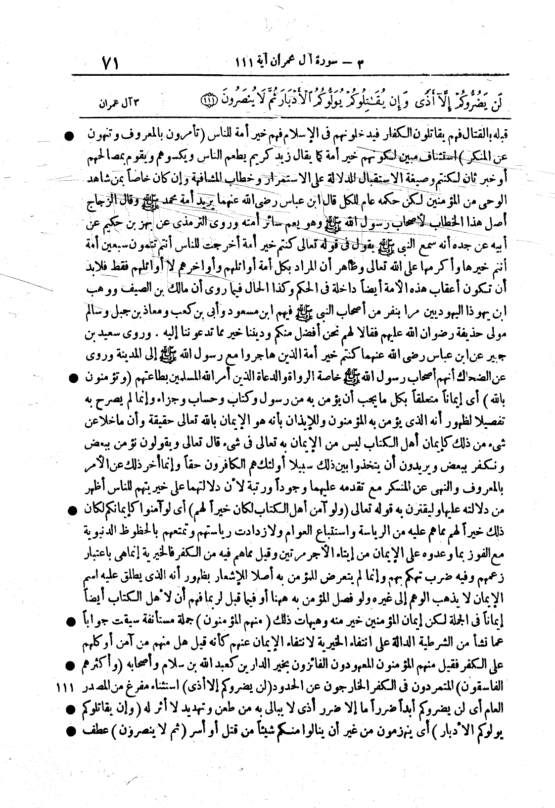 {تَأْمُرُونَ بالمعروف وَتَنْهَوْنَ عَنِ المنكر} استئناف مبين لكونم خيرَ أمة كما يقال زيدٌ كريمٌ يطعم الناسَ ويكسوهم ويقوم بمصالحهم أو خبرٌ ثانٍ لكنتم وصيغةُ الاستقبال للدِلالة على الاستمرار وخطابُ المشافهةِ وإن كان خاصاً بمن شاهد الوحيَ من المؤمنين لكن حُكمَه عامٌ للكل قال ابن عباس رضي الله عنهما يريد أمة محمدٍ صلَّى الله عليهِ وسلم وقال الزجاج أصلُ هذا الخطابِ لأصحاب رسولِ الله صلى الله عليه وسلم وهو يعمُّ سائرَ أمتِه وروى الترمذيُّ عن بَهْزِ بنِ حكيم عن أبيه عن جده أنه سمع النبيِّ صلَّى الله عليهِ وسلم يقول في قوله تعالى {كُنتُمْ خَيْرَ أُمَّةٍ أُخْرِجَتْ لِلنَّاسِ} أنتم تُتِمّون سبعين أمةً أنتم خيرُها وأكرمُها على الله تعالى وظاهرٌ أن المرادَ بكل أمةٍ أوائلهم وأواخرهم لاأوائلهم فقط فلا بد أن تكون أعقابُ هذه الأمةِ أيضاً داخلةً في الحكم وكذا الحالُ فيما رُوي أن مالكَ بنَ الصيف ووهب ابن يهوذا اليهوديَّين مرّا بنفرٍ من أصحاب النبيِّ صلَّى الله عليهِ وسلم فيهم ابنُ مسعود وأبيُّ بنُ كعبٍ ومعاذُ بنُ جبل وسالمٌ مولى حذيفةَ رضوانُ الله عليهم فقالا لهم نحن أفضلُ منكم ودينُنا خيرٌ مما تدعوننا إليه ورَوى سعيدُ بنُ جُبيرٍ عن ابن عباس رضي الله عنهما كُنتُمْ خَيْرَ أُمَّةٍ الذين هاجروا مع رسول الله صلى الله عليه وسلم إلى المدينة ورُوي عن الضحاك أنهم أصحابُ رسولِ الله صلى الله عليه وسلم خاصةً الرواةُ والدعاةُ الذين أمر الله المسلمين بطاعتهم