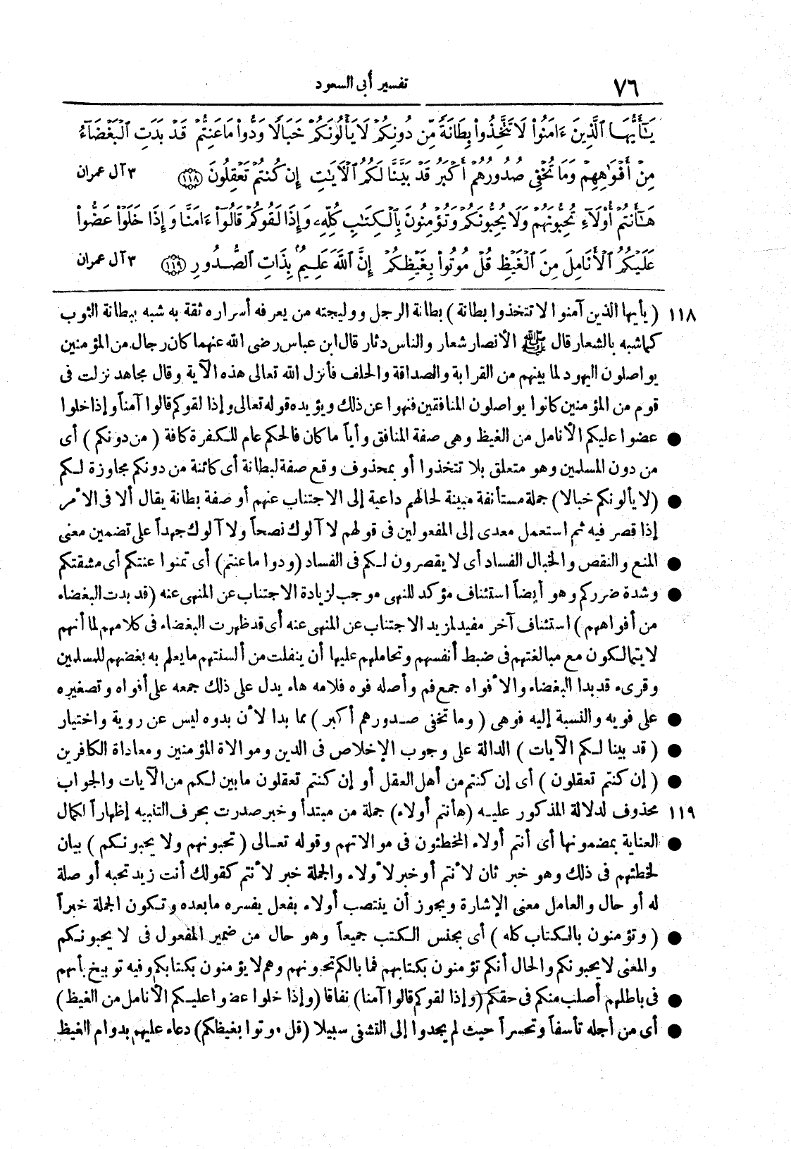 {يَا أَيُّهَا الذينَ آمَنُواْ لاَ تَتَّخِذُواْ بِطَانَةً} بطانةُ الرجل ووَليجتُه مَنْ يُعرِّفه أسرارَه ثقةً به شُبِّه ببطانة الثوب كما شُبِّه بالشعار قال صلى الله عليه وسلم الأنصارُ شِعار والناسُ دِثار قال ابن عباس رضي الله عنهما كان رجال من المؤمنين يواصلون اليهودَ لما بينهم من القرابة والصداقة والحلف فأنزل الله تعالى هذه الآسية وقال مجاهد نزلتْ في قوم من المؤمنين كانوا يواصلون المنافقين فنهو عن ذلك ويؤيده قوله تعالى {وإذا لقوكم قالوا آمنا وإذا خلَوا عَضُّواْ عَلَيْكُمُ الانامل مِنَ الغيظ} وهي صفةُ المنافق وإياً ما كان فالحكمُ عامٌ للكفرة كافةً
