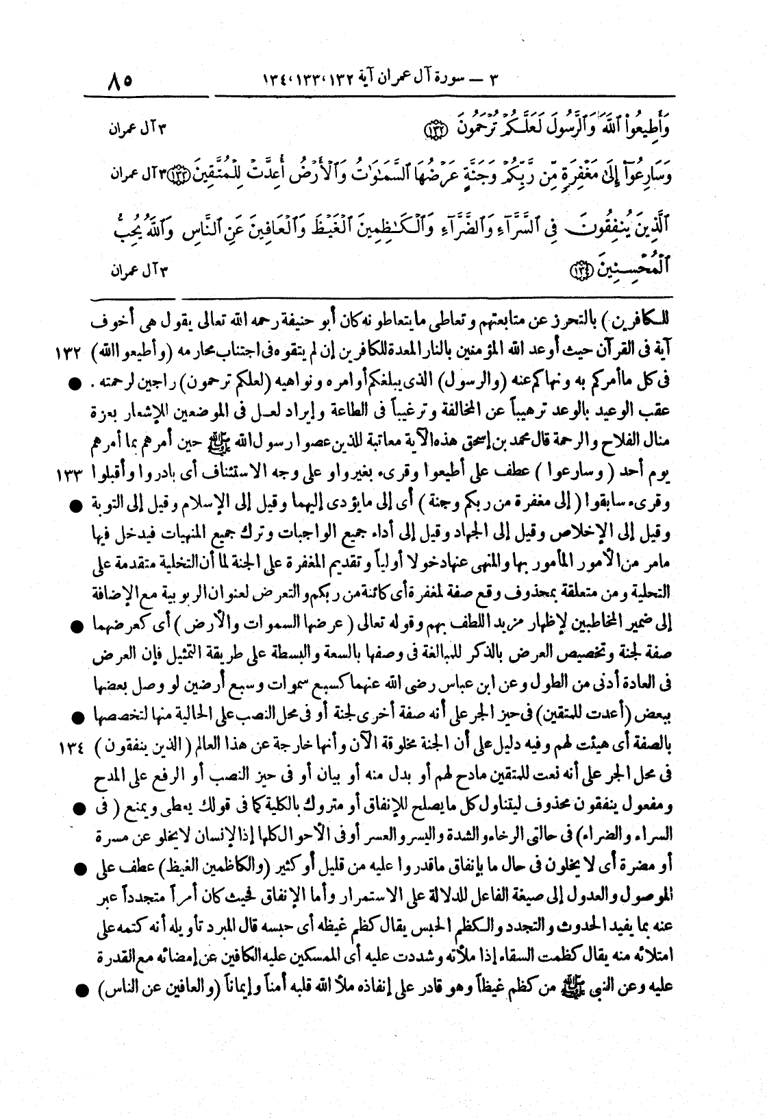 {والكاظمين الغيظ} عطفٌ على الموصول والعدولُ إلى صيغة الفاعلِ للدِلالة على الاستمرار وأما الإنفاقُ فحيث كان أمراً متجدداً عبّر عنه بما يفيد الحدوث والتجدد والكظمُ الحبسُ يقال كظَم غيظه أي حبَسه قال المُبرِّدُ تأويلُه أنه كتمه على امتلائه منه يقال كظمتُ السقاءَ إذا ملأتُه وشددتُ عليه أي المُمْسِكين عليه الكافّين عن إمضائه مع القُدرة عليه وعن النبيِّ صلَّى الله عليهِ وسلم من كظم غيظاً وهو قادرٌ على إنفاذِه ملأ الله قلبه أمناً وإيماناً