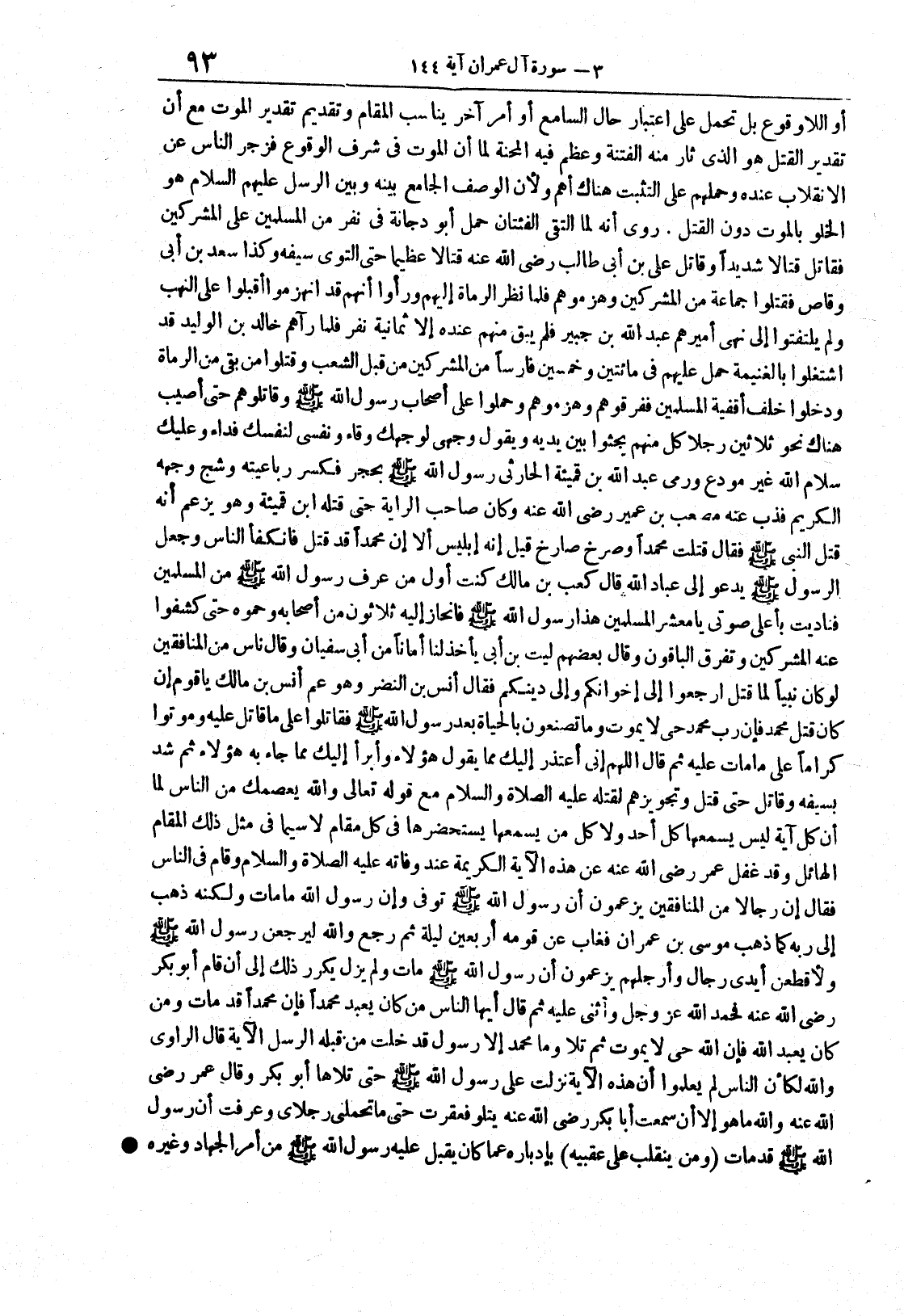 أو اللاوقوعِ بل تُحملُ على اعتبار حالِ السامعِ أو أمرٍ آخرَ يناسب المقامَ وتقديمُ تقديرِ الموتِ مع أن تقديرَ القتلِ هو الذي ثار منه الفتنةُ وعظُم فيه المحنةُ لِما أن الموتَ في شرف الوقوعِ فزجرُ الناسِ عن الانقلاب عنده وحملهم على التثبيت هناك أهمُّ ولأن الوصفَ الجامعَ بينه وبين الرسلِ عليهم السلام هو الخلوُّ بالموت دون القتل روي أنه لما التقى الفئتانِ حمل أبو دجانةَ في نفرٍ من المسلمين على المشركين فقاتل قِتالاً شديداً وقاتل عليُّ بنُ أبي طالبٍ رضي الله عنه قتالاً عظيماً حتى التوى سيفُه وكذا سعدُ بنُ أبي وقاصٍ فقتلوا جماعةً من المشركين وهزموهم فلما نظر الرماةُ إليهم ورأَوْا أنهم قد انهزموا أقبلوا على النَّهْب ولم يلتفتوا إلى نهي أميرهم عبد الله بن جبيرٍ فلم يبقَ منهم عنده إلا ثمانيةُ نفرٍ فلما رآهم خالدُ بنُ الوليدِ قد اشتغلوا بالغنيمة حمل عليهم في مائتين وخمسين فارساً من المشركين من قبل الشعب وقتلوا من بقيَ من الرُماة ودخلوا خلفَ أقفيةِ المسلمين ففرّقوهم وهزموهم وحملوا على أصحاب رسول الله صلى الله عليه وسلم وقاتلوهم حتى أصيب هناك نحوُ ثلاثين رجلاً كلٌّ منهم يجثوا بين يديه ويقول وجهي لوجهك وقاء ونفسي لنفسك فداءٌ وعليك سلامُ الله غيرَ مُودَّعٍ ورمى عبدُ اللَّه بنُ قميئةَ الحارثي رسول الله صلى الله عليه وسلم بحجر فكسر رَباعيتَه وشجُّ وجهَه الكريمَ فذبّ عنه مصعب بن عمير رضي الله عنه وكان صاحبَ الرايةِ حتى قتله ابنُ قميئة وهو يزعُم أنه قتل النبيَّ صلَّى الله عليهِ وسلم فقال قتلت محمدا وصارخ قيل إنه إبليسُ ألا أن محمداً قد قُتل فانكفأ الناسُ وجعل الرسولُ صلى الله عليه وسلم يدعو إليَّ عبادَ الله قال كعبُ بنُ مالك كنت أولُ من عرف رسول الله صلى الله عليه وسلم من المسلمين فناديت بأعلى صوتي يا معشرَ المسلمين هذا رسول الله صلى الله عليه وسلم فانحاز إليه ثلاثون من أصحابه وحموه حتى كشفوا عنه المشركين وتفرّق الباقون وقال بعضُهم ليت بن أُبيَ يأخذ لنا أماناً من أبي سفيانَ وقال ناس من المنافقين لو كانَ نبيَّاً لما قُتل ارجِعوا إلى إخوانكم وإلى دينكم فقال أنسُ بنُ النضر وهو عمُّ أنسِ بنِ مالكٍ يا قوم إن كان قُتل محمدٌ فإن ربَّ محمدٍ حيٌّ لا يموت وما تصنعون بالحياة بعد رسولِ الله صلى الله عليه وسلم فقاتِلوا على ما قاتل عليه وموتوا كِراماً على ما مات عليه ثم قال اللهم إني أعتذر إليك مما يقول هؤلاءِ وأبرَأُ إليك مما جاء به هؤلاء ثم شدّ بسيفه وقاتل حتى قُتل وتجويزهم لقتله عليه الصَّلاةُ والسَّلامُ مع قوله تعالى {والله يَعْصِمُكَ مِنَ الناس} لما أن كلَّ آيةٍ ليس يسمعها كلُّ أحدٍ ولا كلُّ من يسمعها يستحضِرُها في كل مقام لاسيما في مثل ذلك المقامِ الهائل وقد غفَل عمرُ رضي الله عنه عن هذه الآية الكريمةِ عند وفاته عليه الصلاة والسلام وقام في الناس فقال إن رجالاً من المنافقين يزعمون أن رسول الله صلى الله عليه وسلم توفي وإن رسولَ الله ما مات ولكنه ذهب إلى ربه كما ذهب موسى بن عمران فغاب عن قومه أربعين ليلةً ثم رجع والله ليرجِعَنَّ رسول الله صلى الله عليه وسلم ولأُقطِّعن أيديَ رجالٍ وأرجلَهم يزعمون أن رسول الله صلى الله عليه وسلم مات ولم يزل يكرِّرُ ذلك إلى أن قام أبُو بكرٍ رضيَ الله عنه فحمد الله عز وجل وأثنى عليه ثم قال أيها الناسُ من كان يعبُد محمداً فإن محمداً قد مات ومن كان يعبُد الله فإن الله حى لايموت ثم تلا {وَمَا مُحَمَّدٌ إِلاَّ رَسُولٌ قَدْ خَلَتْ مِن قَبْلِهِ الرسل} الآية قال الراوي والله لكأن الناسَ لم يعلموا أن هذه الآيةَ نزلت على رسُولِ الله صَلَّى الله عليه وسلم حتى تلاها أبو بكر وقال عمر رضي الله عنه والله ما هو إلا أن سمعتُ أبا بكرٍ رضيَ الله عنْهُ يتلو فعقرت حتى ماتحملنى رجلاي وعرفتُ أن رسولَ الله صلى الله عليه وسلم قد مات