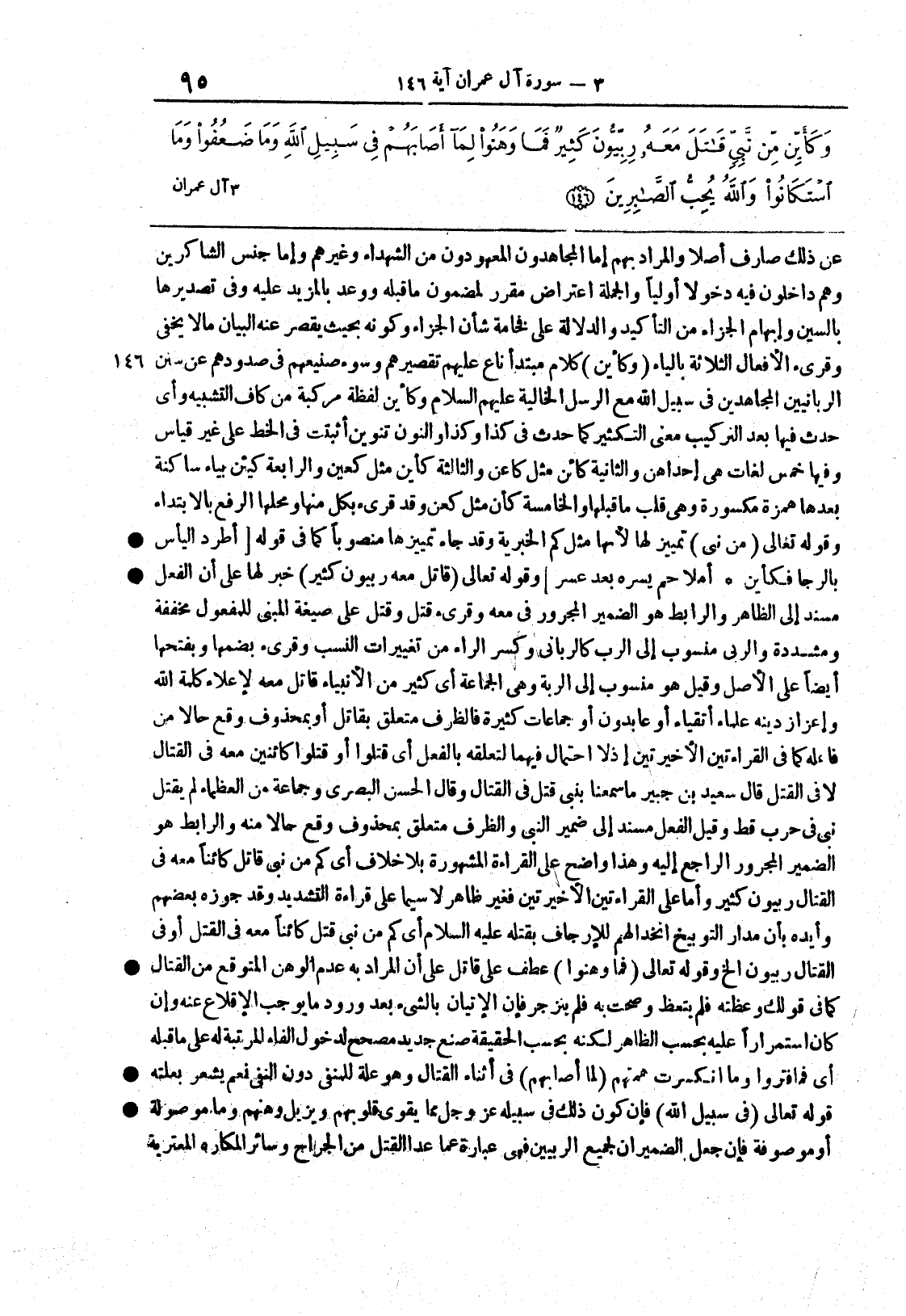 {قَاتَلَ مَعَهُ رِبّيُّونَ كَثِيرٌ} خبرٌ لها على أن الفعلَ مسندٌ إلى الظاهر والرابطُ هو الضمير المجرورُ في معه وقرئ قُتِل وقُتّل على صيغة المبني للمفعول مخففةً ومشددةً والرِّبِّيُّ منسوبٌ إلى الرب كالرَّباني وكسرُ الراء من تغييرات النسب وقرئ بضمها وبفتحها أيضاً على الأصل وقيل هو منسوبٌ إلى الرَّبة وهي الجماعة أي كثيرٌ من الأنبياء قاتلَ معه لإعلاء كلمةِ الله وإعزاز دينِه علماءُ أتقياءُ أو عابدون أو جماعاتٌ كثيرة فالظرفُ متعلقٌ بقاتل أو بمحذوفٍ وقعَ حالاً من فاعله كما في القراءتين الأخيرتين إذ لا احتمالَ فيهما لتعلقه بالفعل أي قُتلوا أو قُتّلوا كائنين معه في القتال لا في القتل قالَ سعيدُ بنُ جُبيرٍ ما سمعنا بنبي قُتل في القتال وقال الحسنُ البصري وجماعةٌ من العظماء لم يقتَلْ نبي في حرب قطُّ وقيل الفعلُ مسندٌ إلى ضمير النبي والظرف متعلقٌ بمحذوفٍ وقعَ حالاً منه والرابطُ هو الضميرُ المجرورُ الراجعُ إليه وهذا واضحٌ على القراءة المشهورة بلا خلاف أي كم من نبي قاتلَ كائناً معه في القتال ربيون كثير وأما على القراءتين الأخيرتين فغيرُ ظاهرٍ لا سيما على قراءة التشديد وقد جوّزه بعضُهم وأيّده بأن مدارَ التوبيخ اتخذالهم للإرجاف بقتلِه عليه السلام أي كم من نبي قُتل كائناً معه في القتل أو في القتال ربيون الخ وقوله تعالى