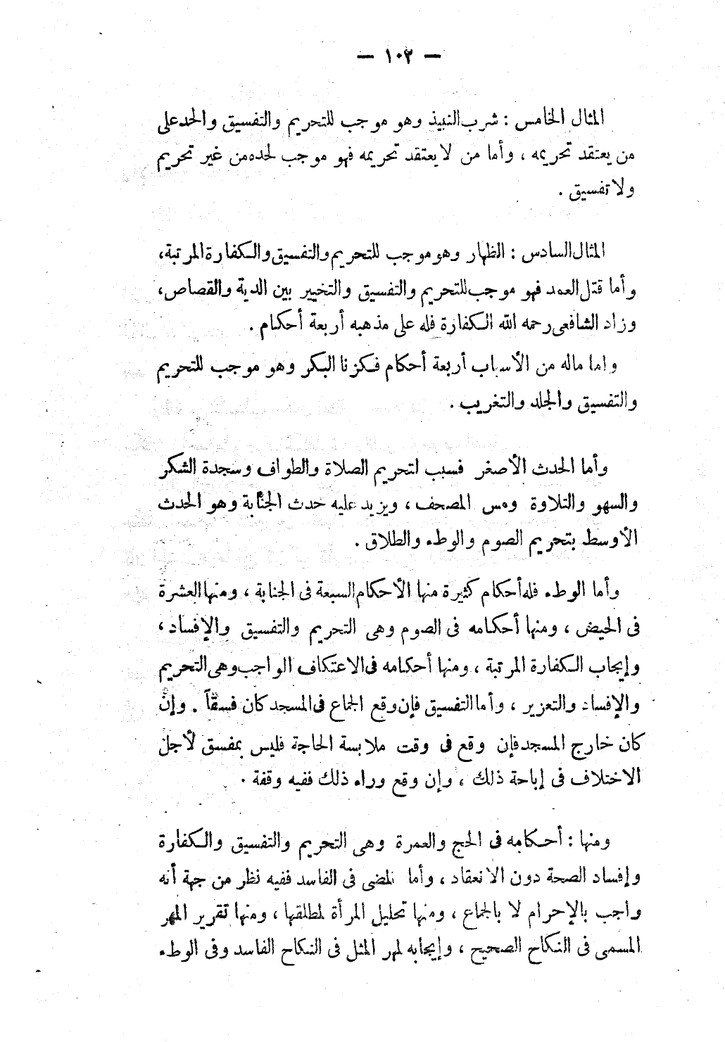 الْمِثَالُ الْخَامِسُ: شُرْبُ النَّبِيذِ وَهُوَ مُوجِبٌ لِلتَّحْرِيمِ وَالتَّفْسِيقِ وَالْحَدِّ عَلَى مَنْ يَعْتَقِدُ تَحْرِيمَهُ، وَأَمَّا مَنْ لَا يَعْتَقِدُ تَحْرِيمَهُ فَهُوَ مُوجِبٌ لِحَدِّهِ مِنْ غَيْرِ تَحْرِيمٍ وَلَا تَفْسِيقٍ.